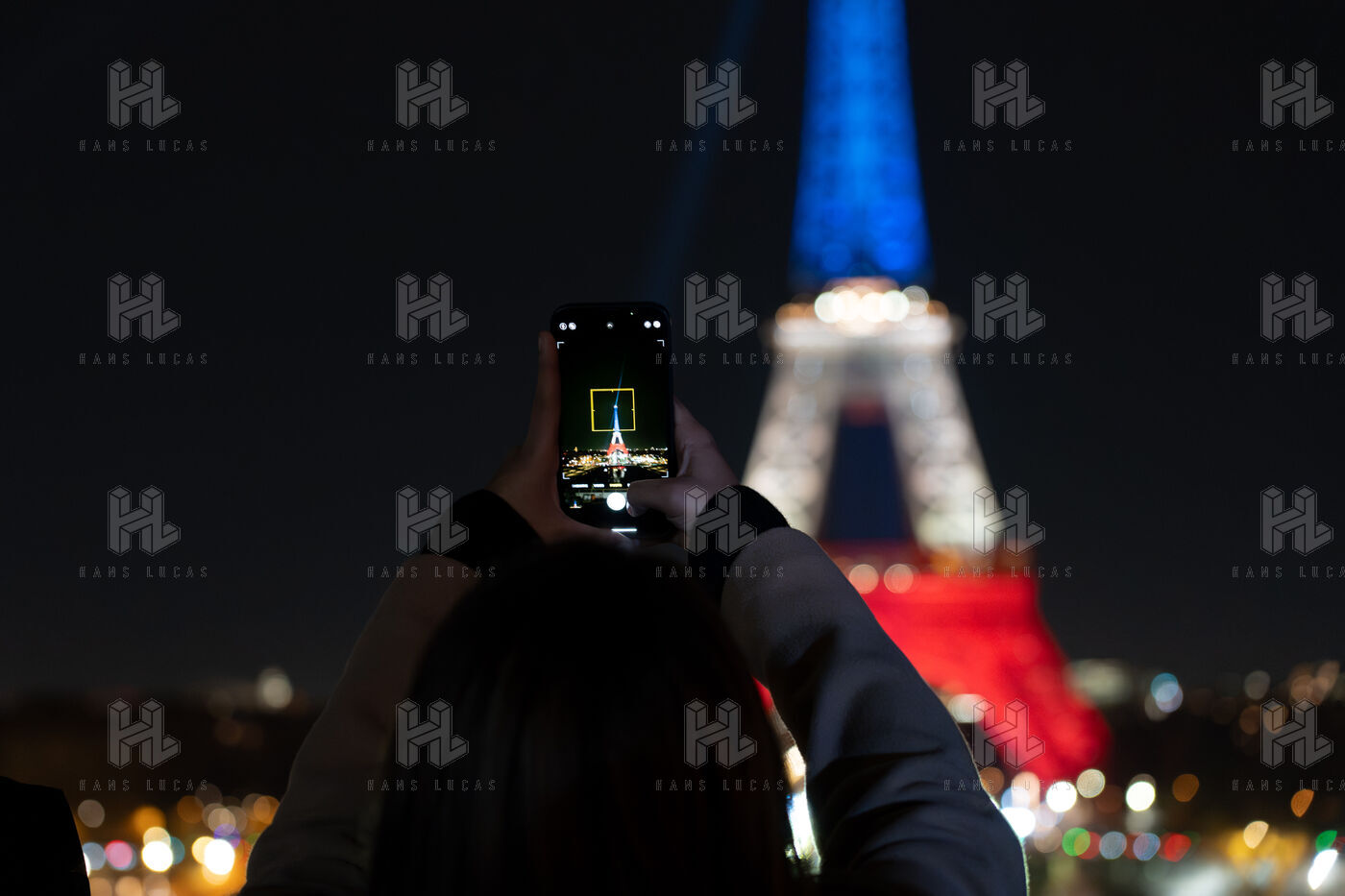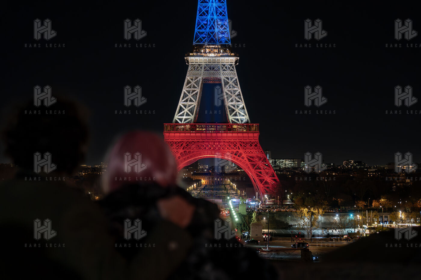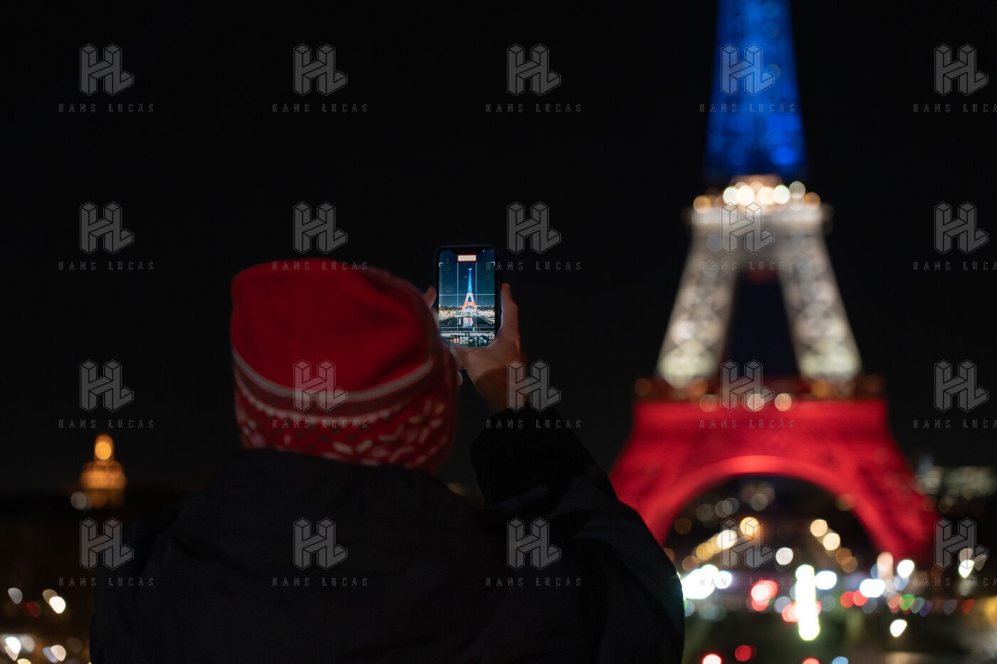 On the 10th anniversary of the attacks of November 13, 2015, and in tribute to the victims, the city of Paris illuminated the Eiffel Tower in the colors of the French flag, blue, white, and red.