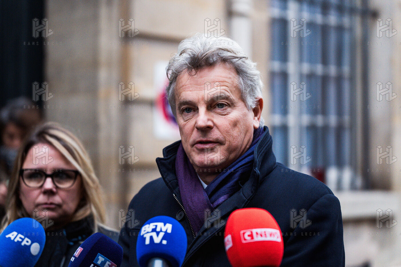 Point presse des dirigeants de partis de l'opposition des groupes parlementaires devant l'hôtel de Matignon en sortie de réunion avec le Premier Ministre pour le projet de loi spéciale du budget 2026.