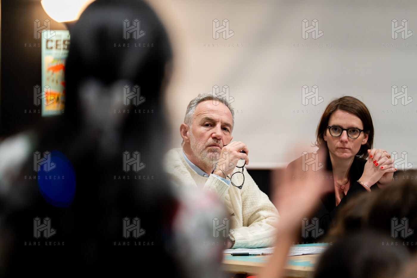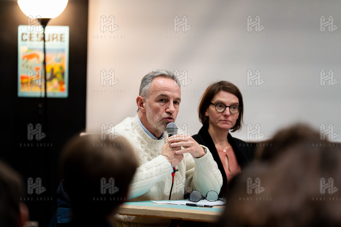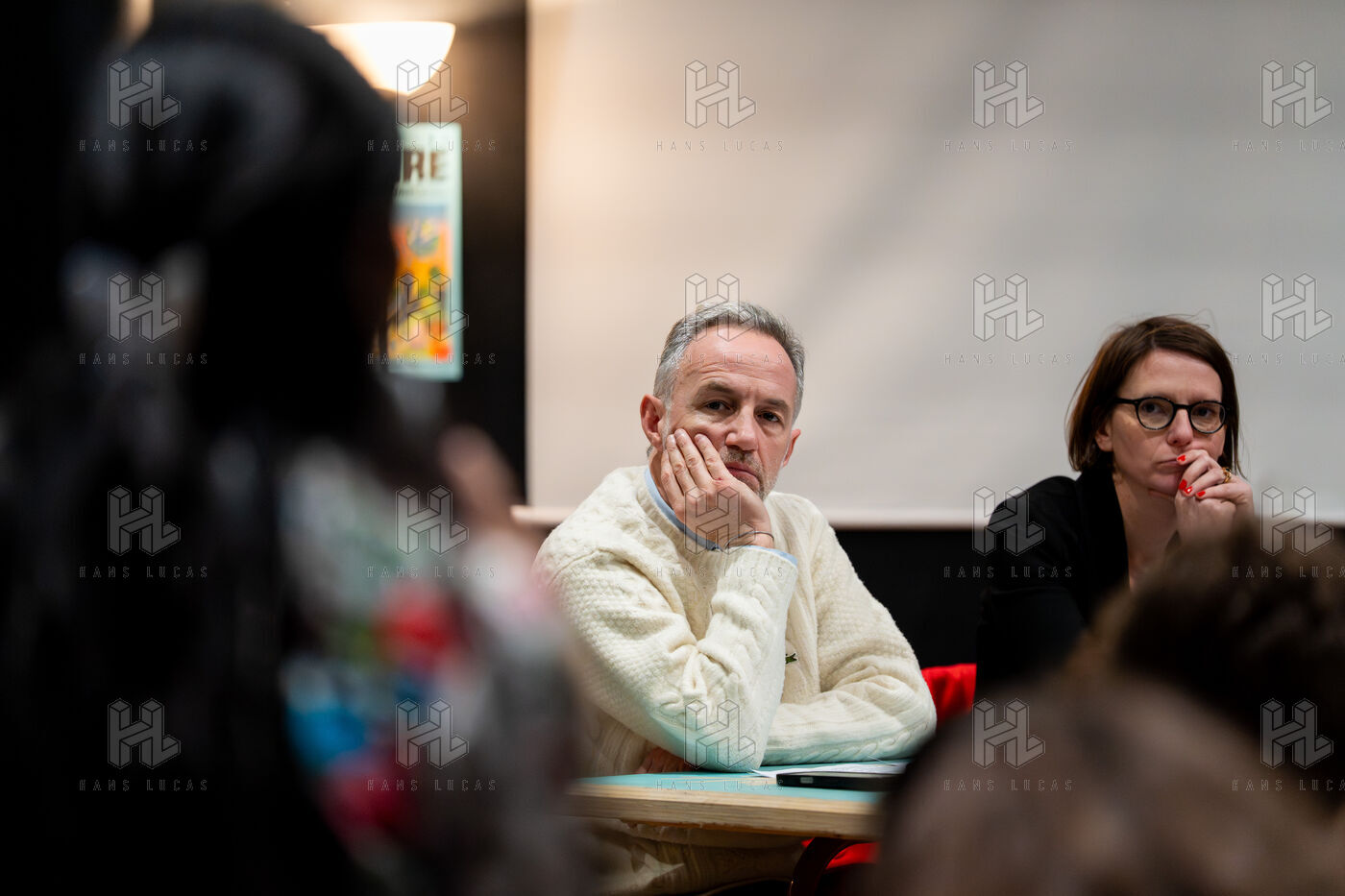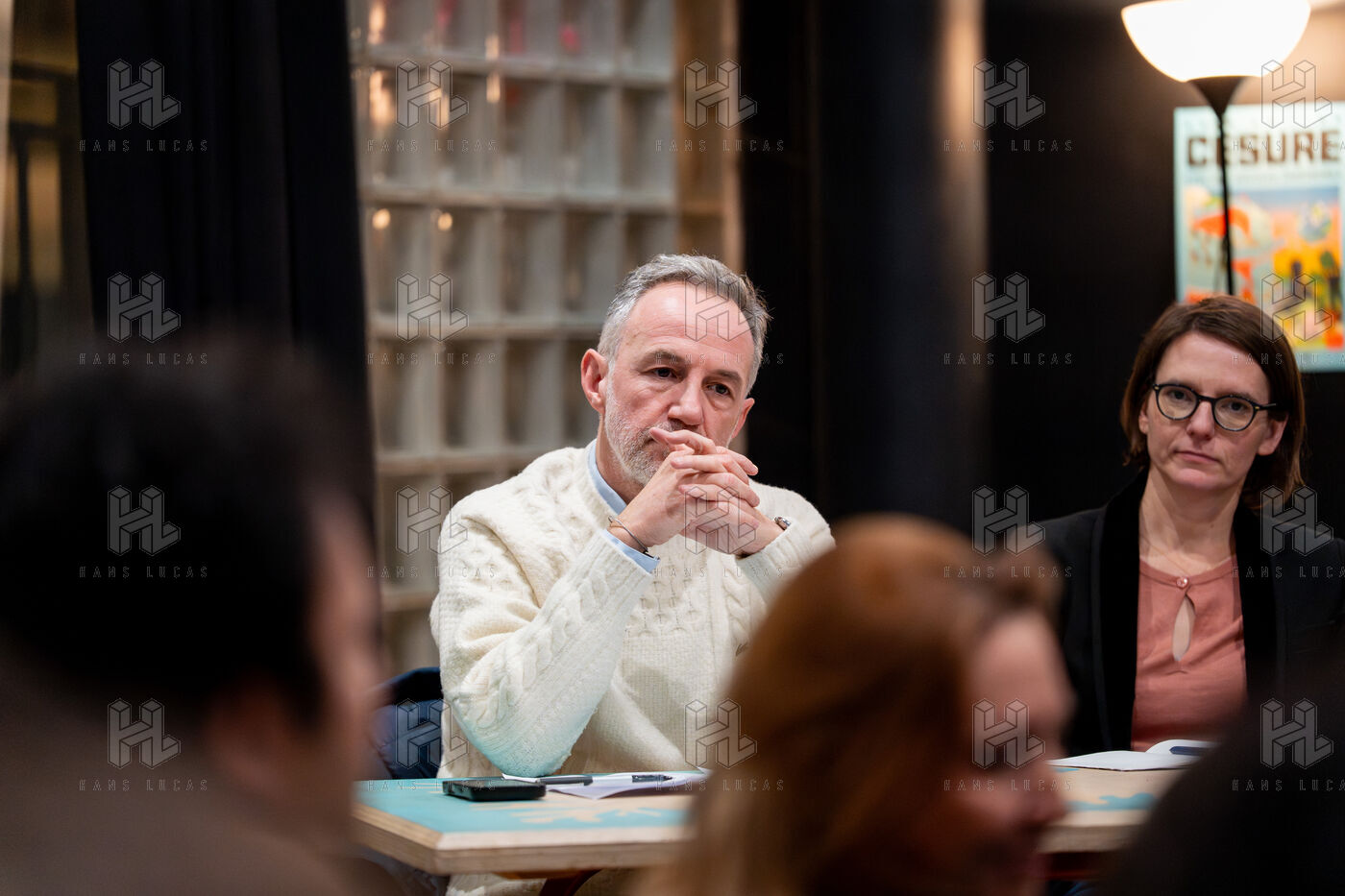 Emmanuel Grégoire, candidat du Parti socialiste PS à la mairie de Paris pour les élections municipales de 2026 échange avec les étudiants, leurs associations et organisations syndicales pour leurs exposer son programme au Césure dans le 5ème arrondissement.