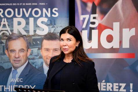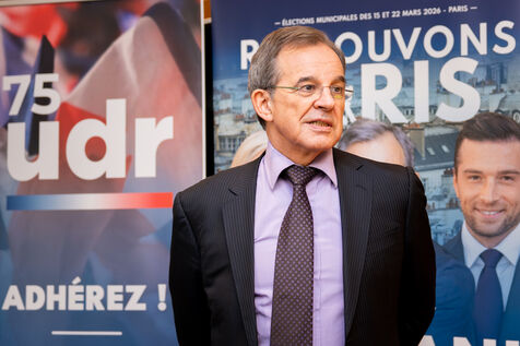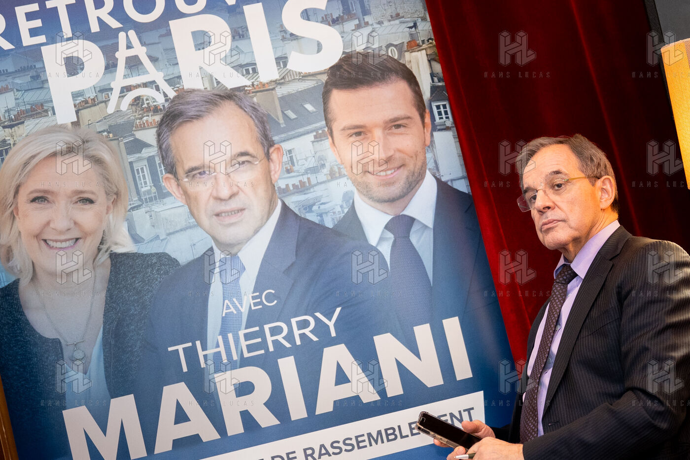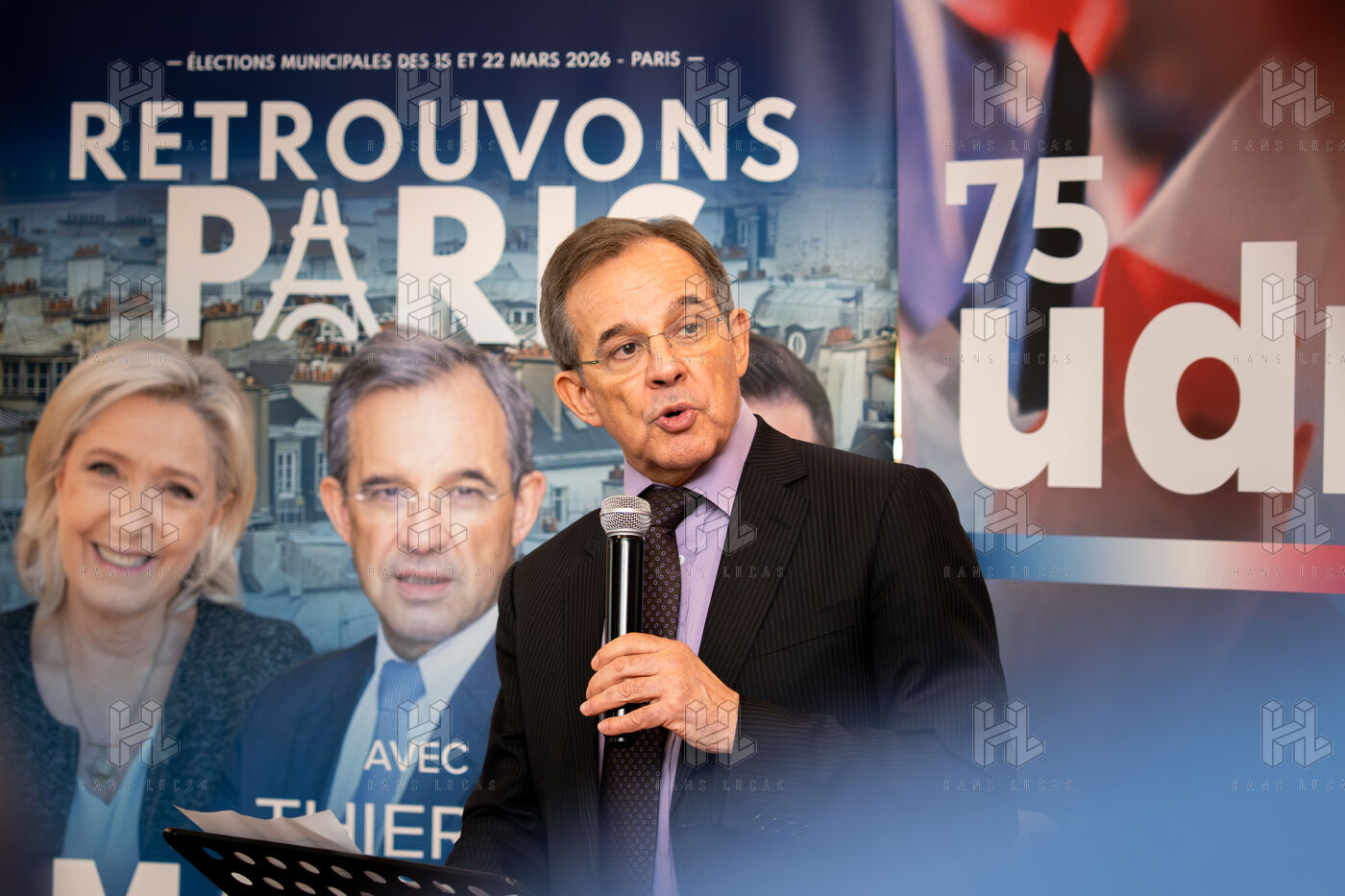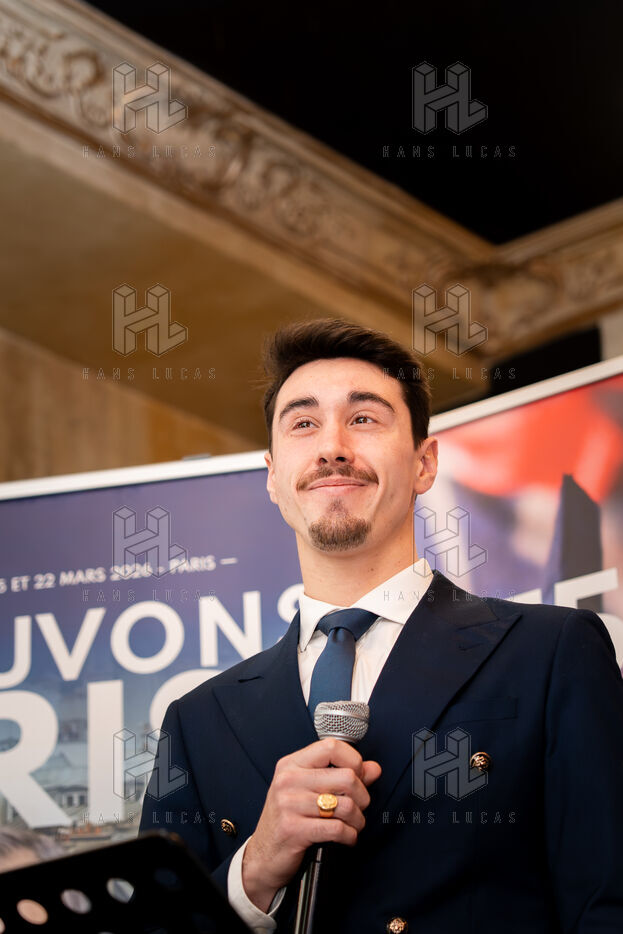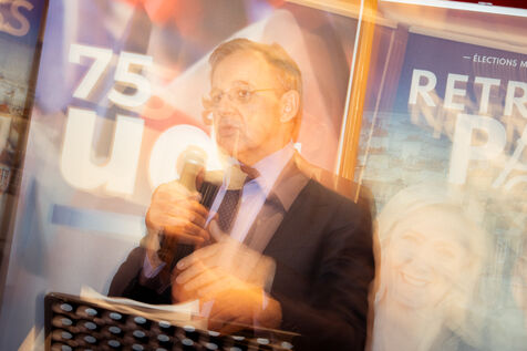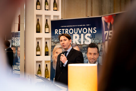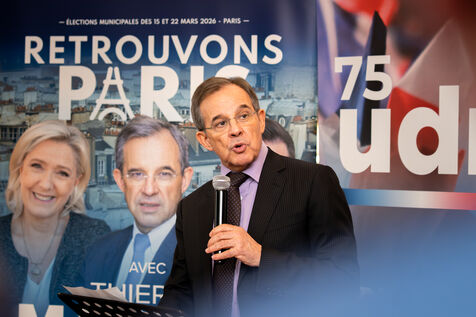 Press conference with Thierry Mariani, candidate for the National Rally (RN), Union of the Right (UDR), and Identity Freedom (IDL) parties in the 2026 Paris municipal elections, at the Bistrot de la Gaite, accompanied by eight leading candidates for Paris, on the topic of schools and extracurricular activities.