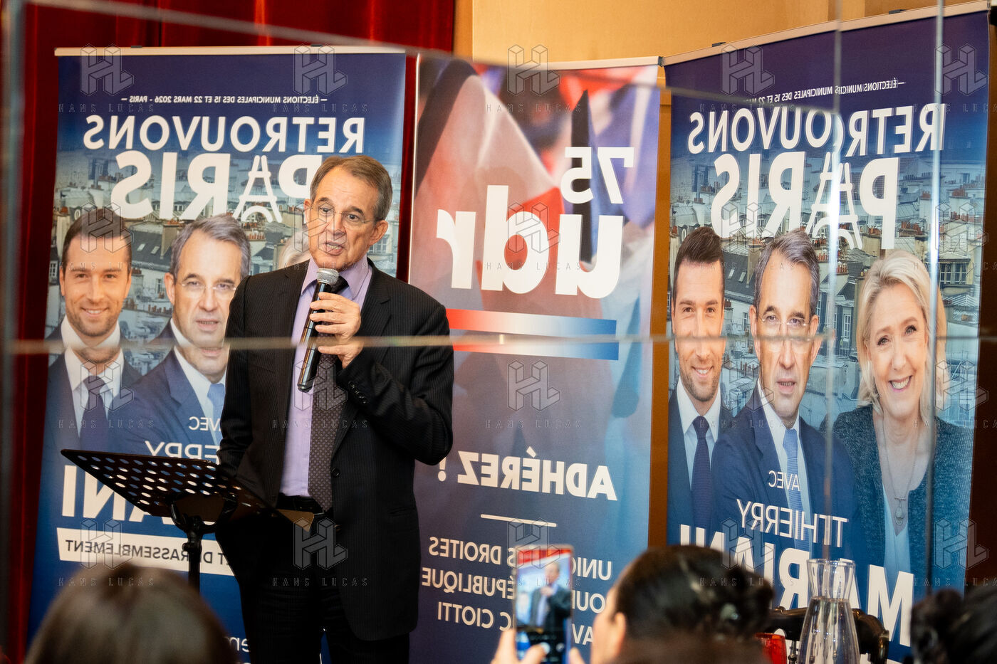 Conférence de presse de Thierry Mariani, candidat Rassemblement National RN, Union des droites UDR et Identité Liberté IDL pour les élections municipales de Paris 2026 au Bistrot de la Gaité, accompagné de huit têtes de liste pour Paris, sur le thème de l'école et le périscolaire.