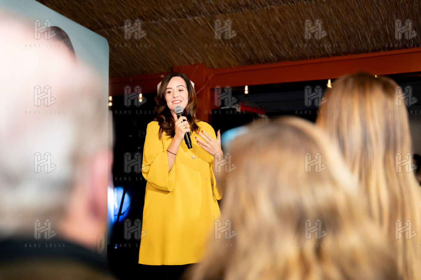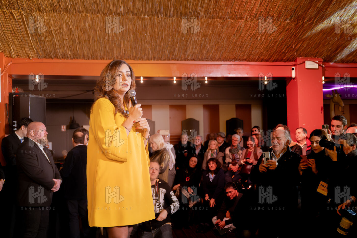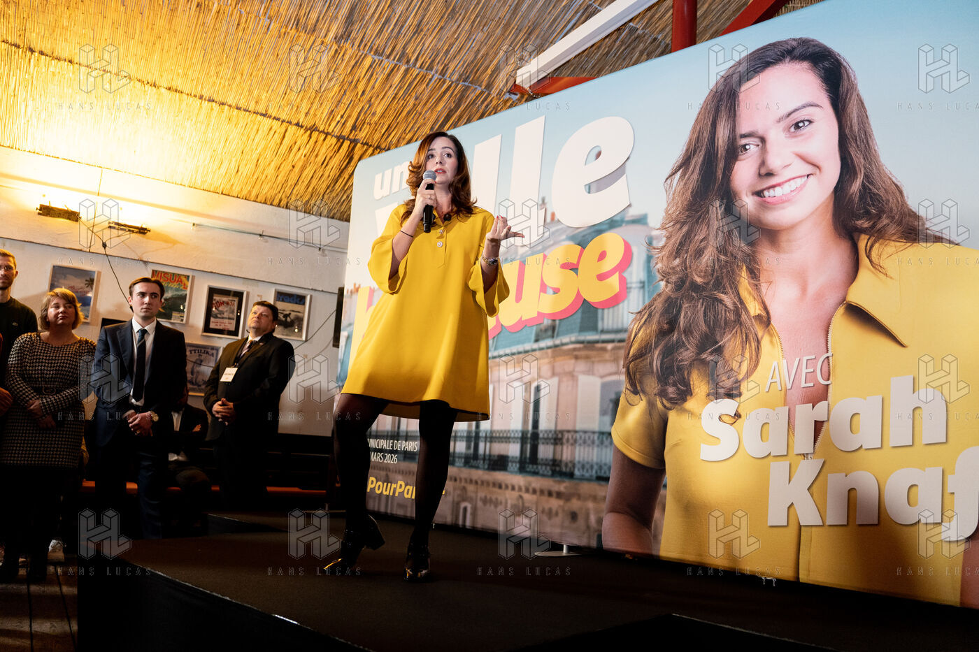 Campaign meeting with Sarah Knafo, Reconquête! candidate for mayor of Paris in the 2026 municipal elections in the 16th arrondissement, with local residents. She announced that she was running for mayor of the 16th arrondissement.