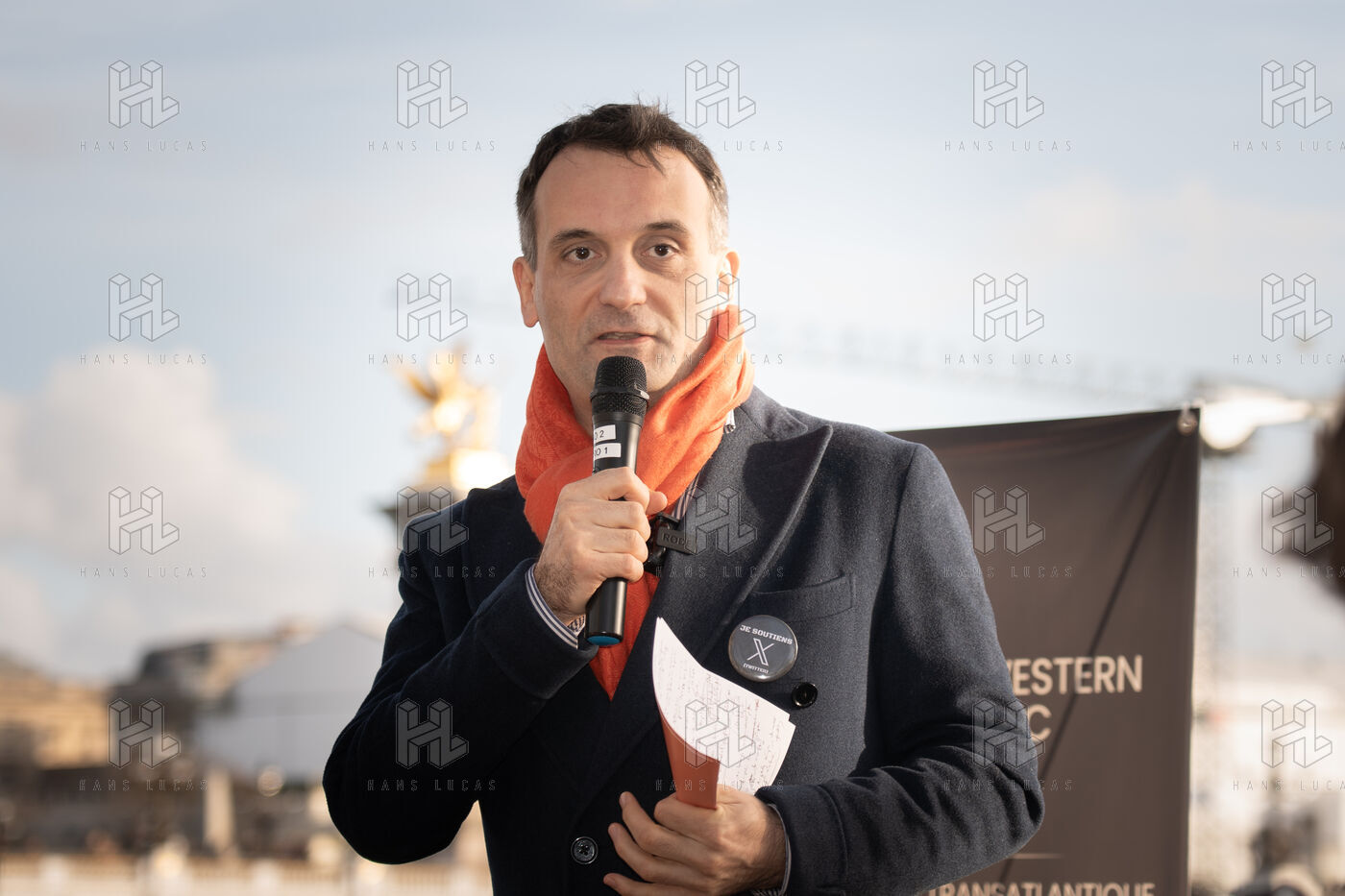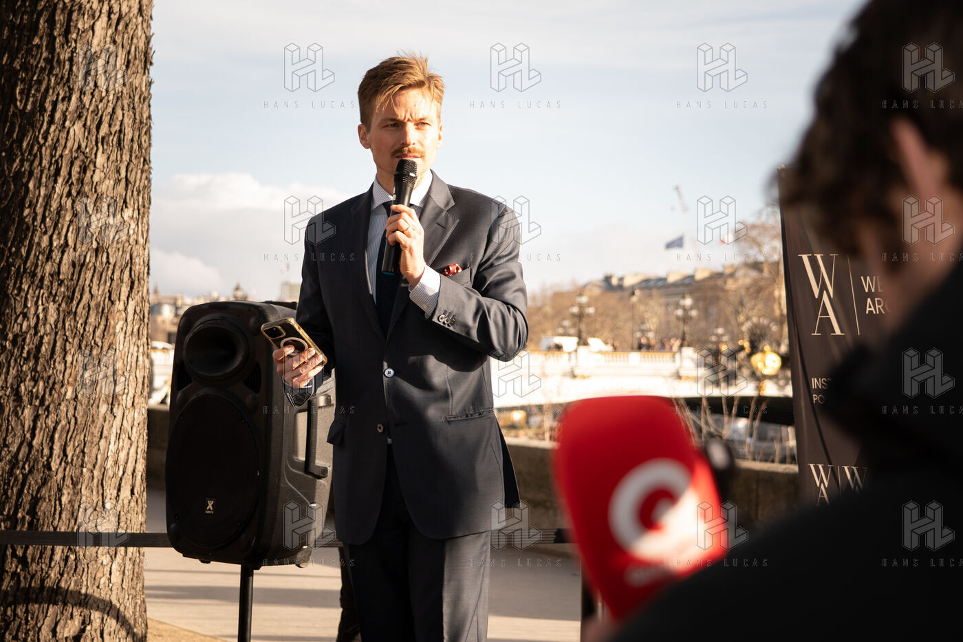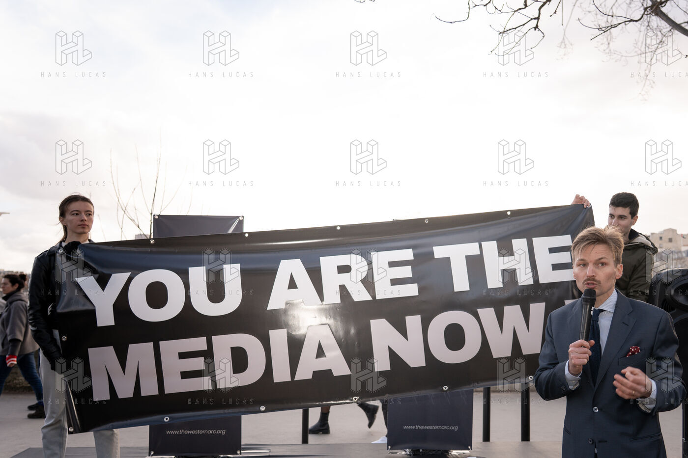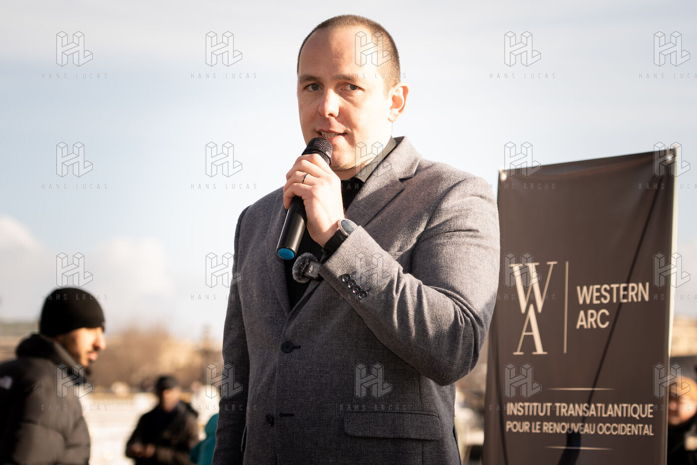 Mobilization organized by Nicolas Conquer, founder of Western Arc, a conservative think tank inspired by MAGA USA, to defend freedom of speech after the raid on the premises of social network X in Paris.