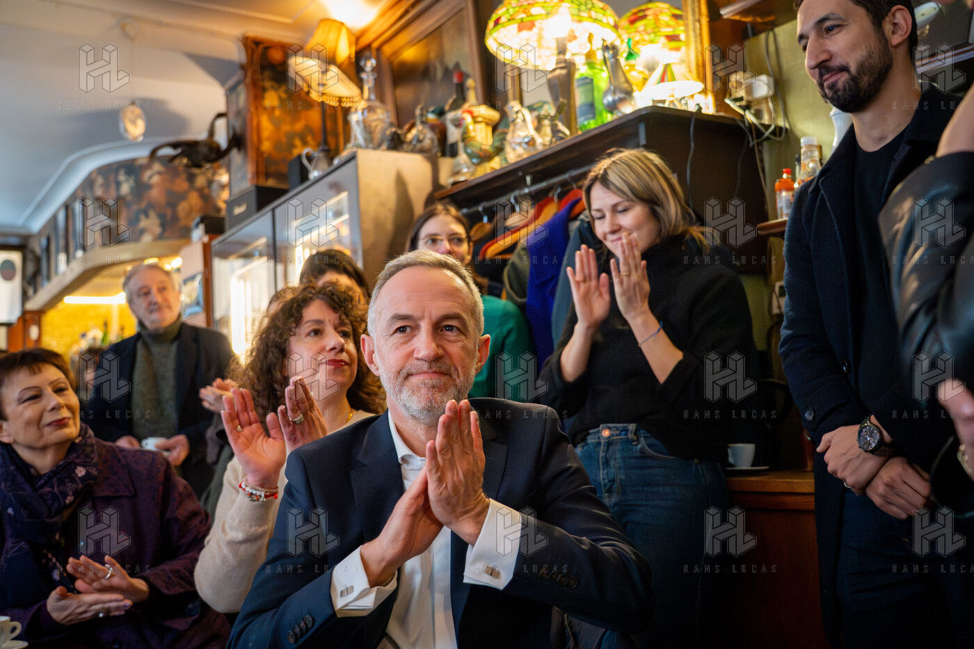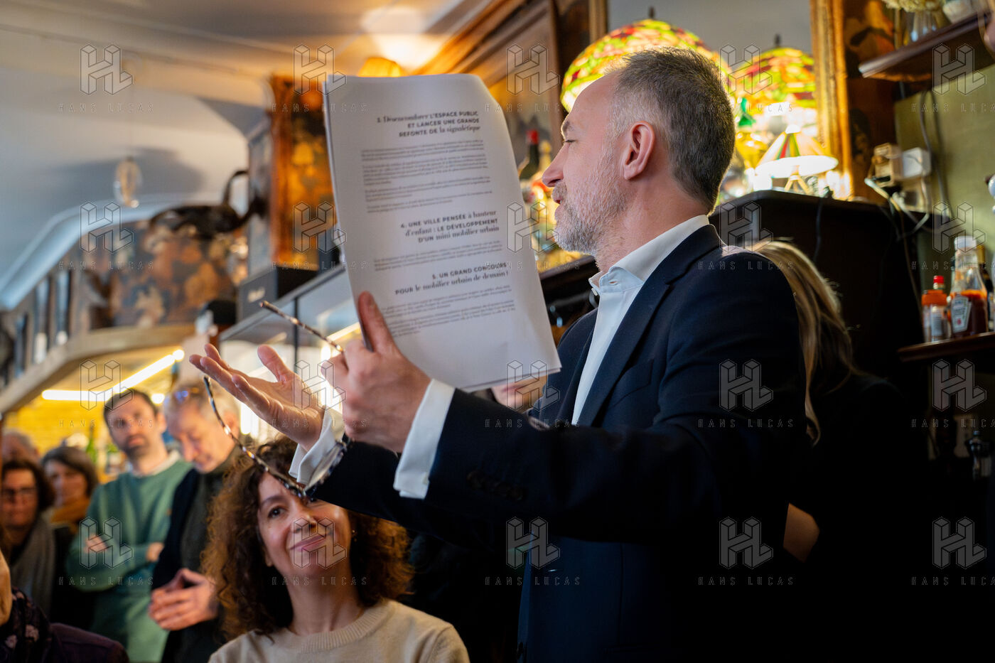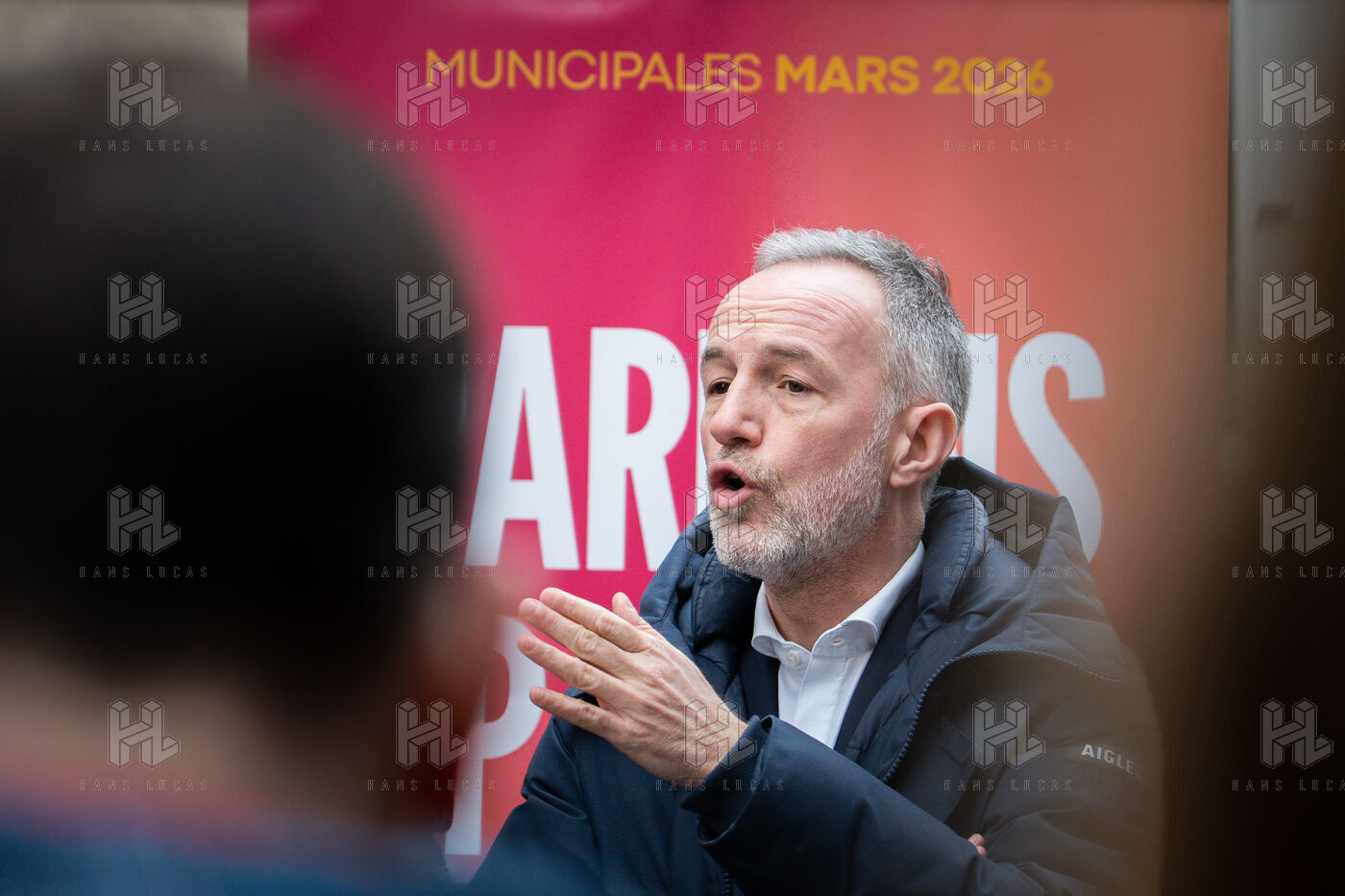 Emmanuel Grégoire, candidat de la "Gauche Unie" à la mairie de Paris pour les élections municipales 2026 déambule rue Chaptal dans le 9ème arrondissement avant de présenter son programme sur l'esthétisme et "Le droit à la beauté de Paris" au café L'Annexe.