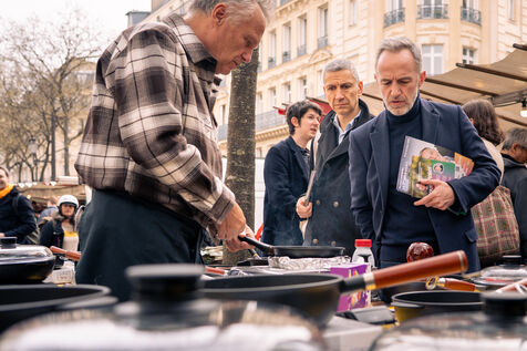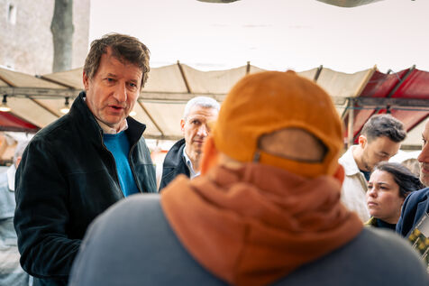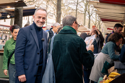 Emmanuel Grégoire, candidat de la "Gauche Unie" en déambulation sur le marché des Batignolles dans le 17ème arrondissement dans le cadre de la campagne pour les élections municipales 2026 accompagné de Yannick Jadot, sénateur "Les Écologistes" et Théa Fourdrinier, du parti Place Publique et candidate pour la Mairie du 8ème arrondissement.