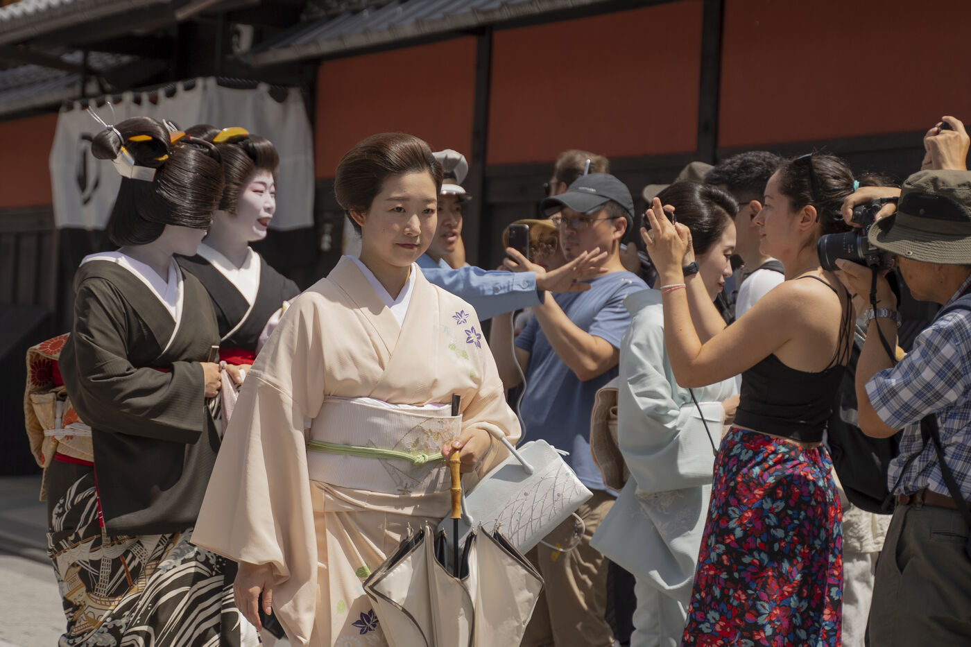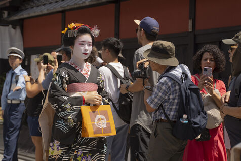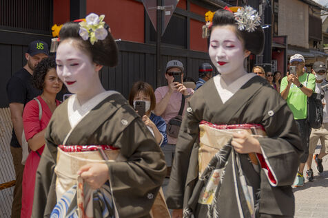 Geishas wander from one teahouse to another in the Gion district of Kyoto.