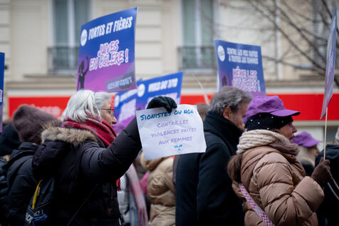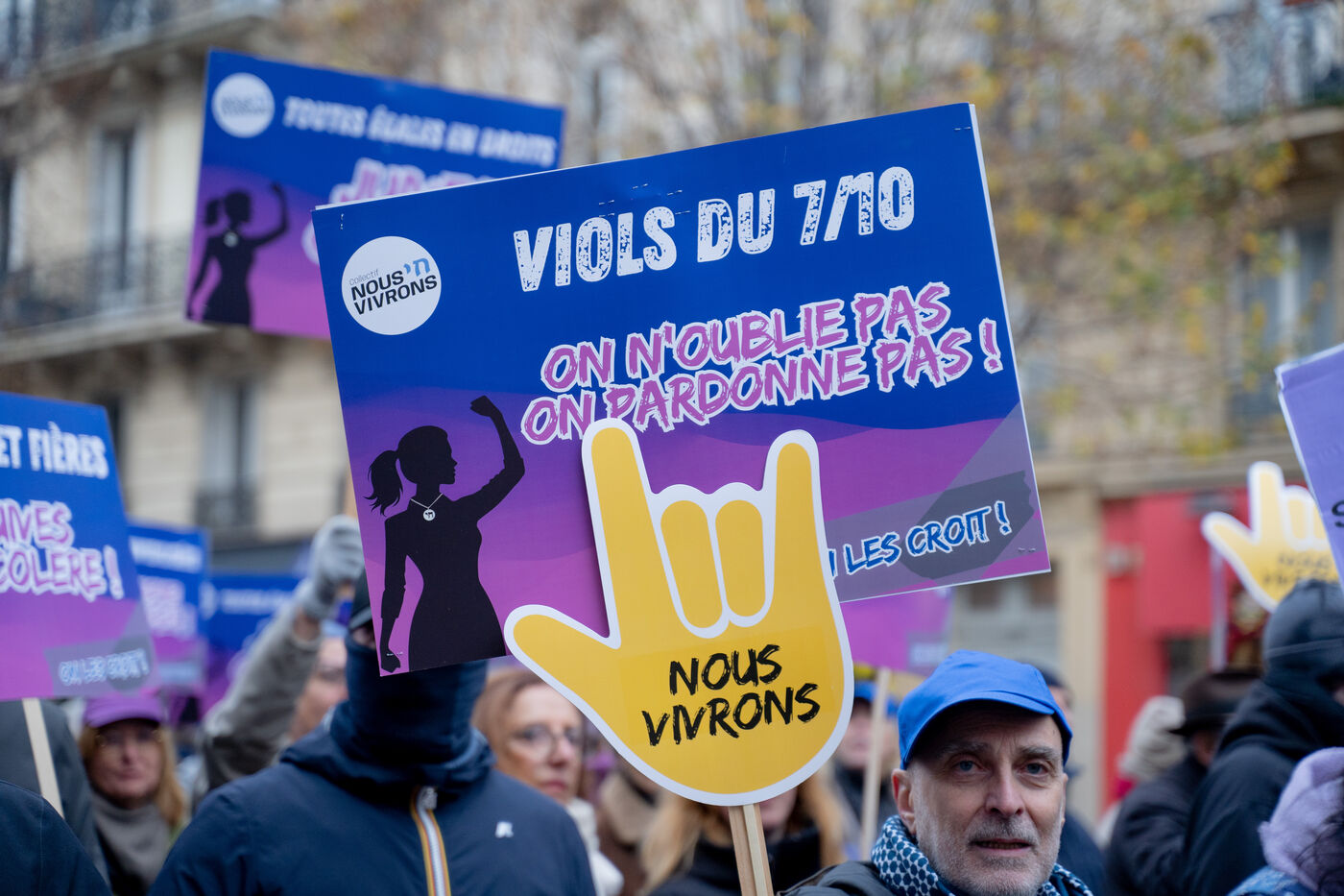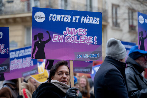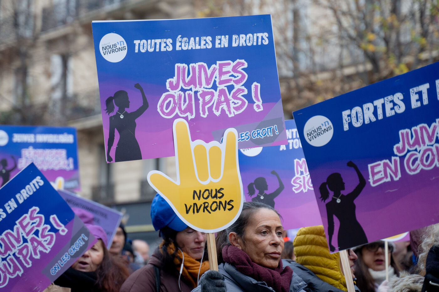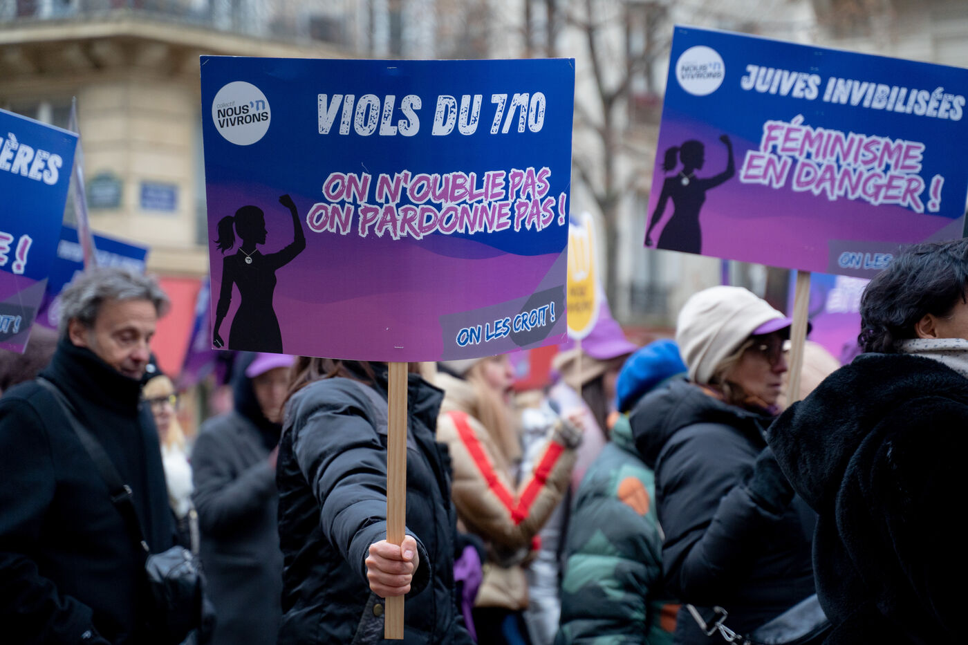 A demonstration organized by the Nous Vivrons collective, held in the lead-up to the International Day for the Elimination of Violence against Women. This anti-Semitism collective, formed after the October 7 attacks, marched with signs reading "All equal in rights, Jewish or not." and "Jewish women made invisible. Feminism in danger!"