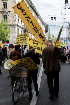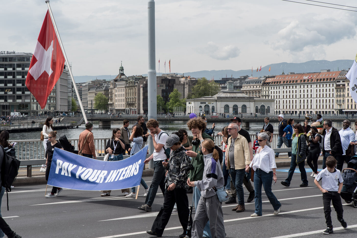 À l'occasion du 1er Mai et de la fête du travail, bien que ce jour ne soit pas férié à Genève en Suisse, la population s'est tout de même réunie pour défiler en cortège et proner diverses revendications. En tête et fin de cortège, un bloc pro-Palestinien très présent.