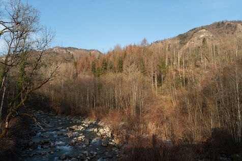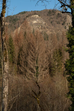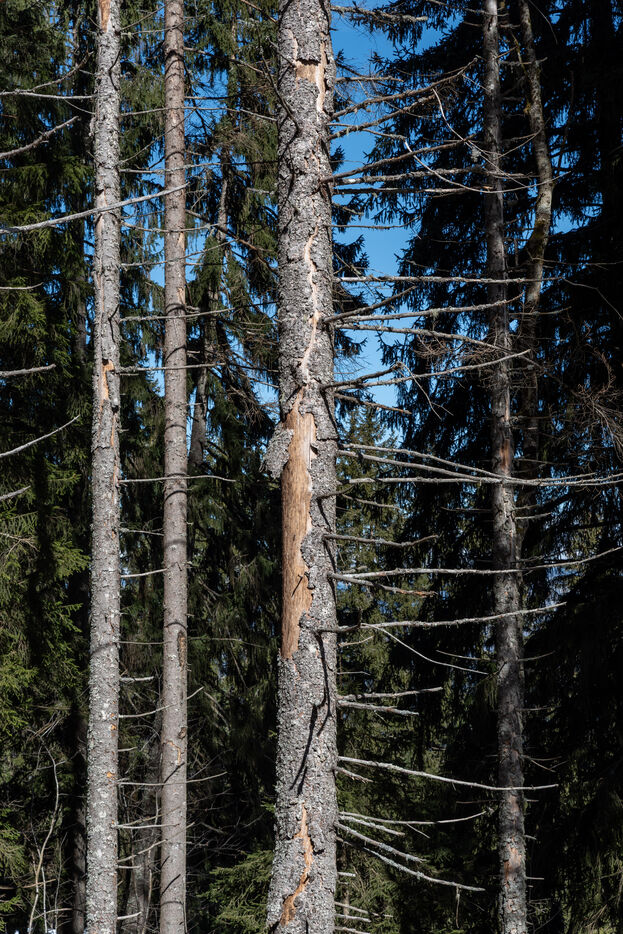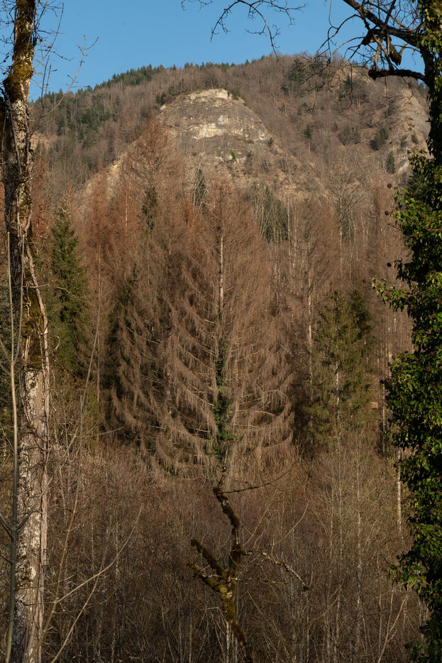 On 16th January 2024, a prefectoral decree was issued in the AURA region to combat the proliferation of Ips typographis, the spruce bark beetle. The status is classified as epidermal, as the scourge is threatening the existence of high-altitude forests. Between increasingly frequent episodes of climatic stress and the survival of this small insect thanks to less extreme winter temperatures, the spruce can no longer resist. Once attacked and weakened, it dies within a season. With it disappear precious CO2 sinks, part of the economic income of the local timber industry and safety in these mountain areas increasingly at risk. The consequences of this epidemic - dry trees and clear-cutting - are drastically changing the landscape of Haute-Savoie, the department worst affected. The landscape to which our society claims to be so attached is disappearing. Nature reclaimed its rights over the choices made by man 50 years earlier. For most of the area, spruce was planted as a monoculture in the 1970s. This reversal of fortune is a powerful visual testimony to the power struggle between man and nature. It is visual proof of the very real presence of climate change in the Alps.