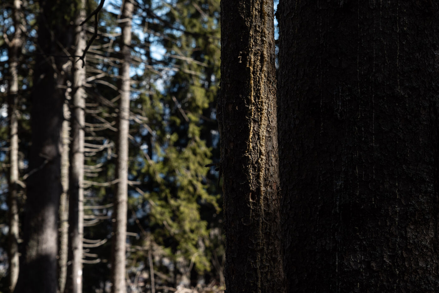 Le 16 janvier 2024, un arrêté préfectoral est émis sur la région AURA pour lutter contre la prolifération du Ips typographis, le scolyte de l’épicéa. Le statut est classé épidermique, le fléau mettant en péril l’existence des forêts d’altitude. Entre des épisodes de stress climatiques de plus en plus fréquents et la survie de ce petit insecte grâce à des températures moins extrêmes l’hiver, l’épicéa ne résiste plus. Fragilisé, une fois attaqué, il meurt en une saison. Disparaissent avec lui des précieux puits de CO2, une partie des revenus économiques de la filière bois locale et une sécurité dans ces zones montagnardes de plus en plus à risque. Arbres secs et coupes rases, les conséquences de cette épidémie modifient drastiquement le paysage de la Haute-Savoie, département le plus touché. Disparait alors ce paysage auquel notre société se dit pourtant tant attachée. La nature reprend ses droits sur le choix des hommes 50 ans auparavant. Car pour la plus grande partie du territoire, l’épicéa fût planté dans les années 1970 en monoculture. Ce retournement de situation est l’occasion d’un témoignage visuel fort sur le rapport de force entre l’homme et la nature. C’est une preuve en images de la présence bien réelle du dérèglement climatique dans les Alpes.