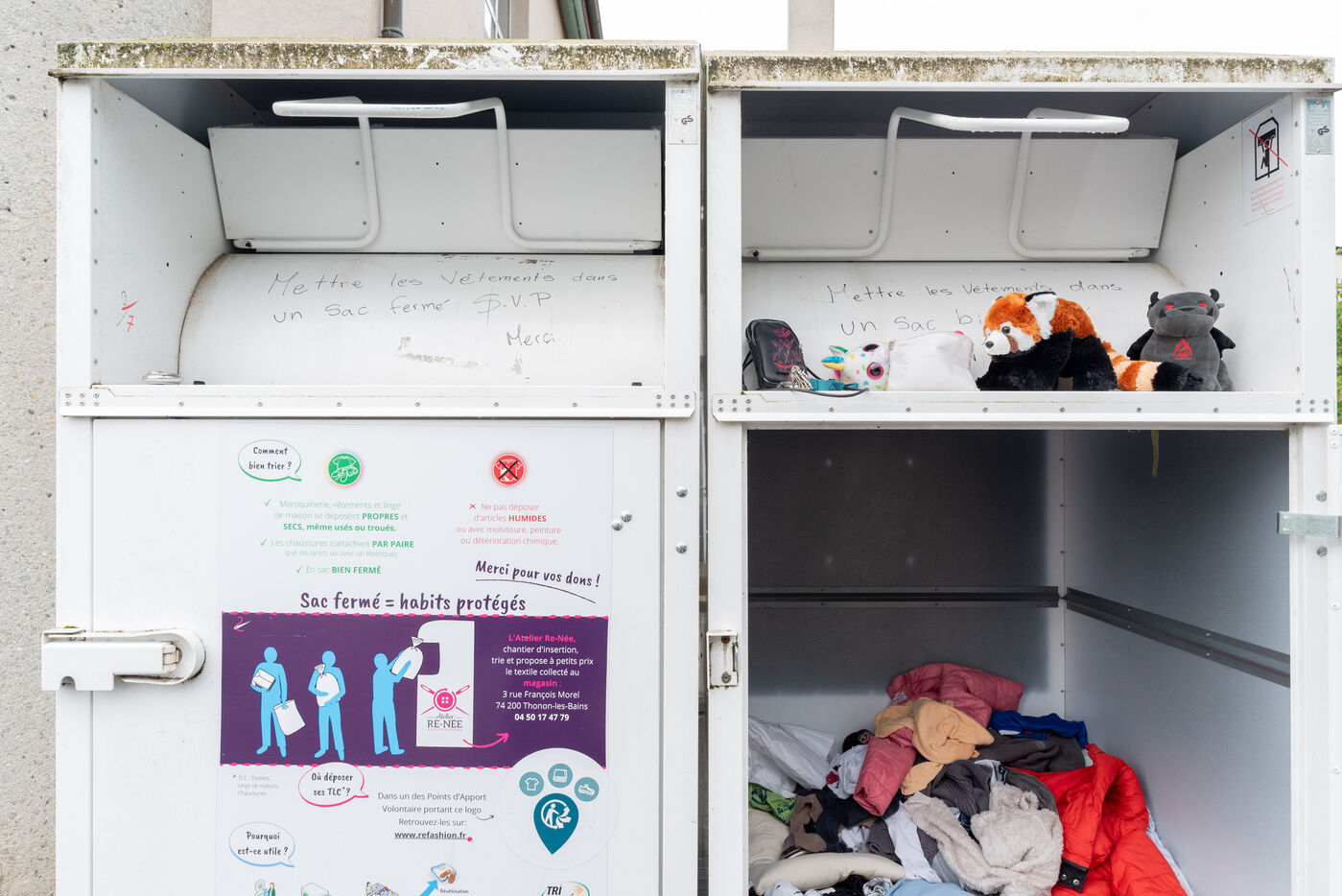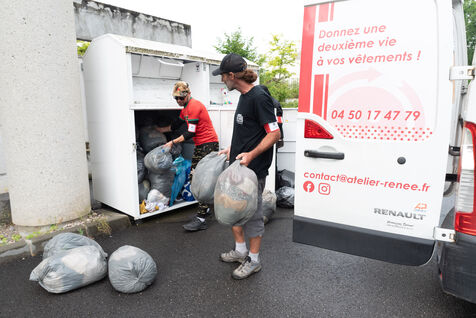 Au volant de leur camionnette, ils ouvrent les uns après les autres ces caissons qui bordent les routes. Toujours pleins à craquer, c'est l'envers du décors de la surconsommation qui se cache derrière ces portes appelants aux dons. Que deviennent ces vêtements et chaussures pour lesquels nous pensons faire une bonne action ? Qui déplace ces tonnes de marchandises, parfois presque neuves, parfois importables ? Depuis 2016, L'Atelier Re-Née à Thonon-les-Bains est l'association chargée de la collecte de TLC (Textiles, Linges et Chaussures) du Chablais où la majeure partie des dons sont ensuite envoyés en centre de tri et le reste dans leur atelier en vue d'une seconde vie localement. Tous les jours, plus de deux tonnes de marchandises sont collectés par deux équipes de trois personnes. Le temps d'une matinée, j'ai pu suivre Sébastien et Fakir, tout deux agent de collecte.