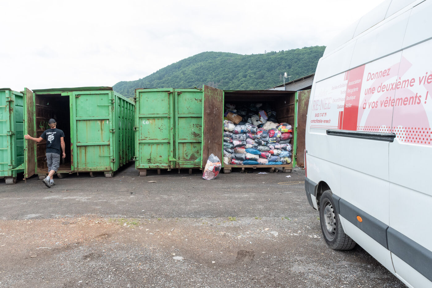 At the wheel of their vans, one by one they open the boxes that line the roads. Always full to bursting, it's the other side of over-consumption that hides behind these doors calling for donations. What happens to the clothes and shoes we think we're doing a good deed for? Who moves these tonnes of goods, sometimes almost new, sometimes non usable? Since 2016, L'Atelier Re-Née in Thonon-les-Bains has been the association responsible for collecting TLC (Textiles, Linens and Footwear) from the Chablais region, where most of the donations are then sent to a sorting centre and the rest to their workshop for a second life locally. Every day, more than two tonnes of goods are collected by two teams of three people. I spent a morning with Sébastien and Fakir, both collection agents.
