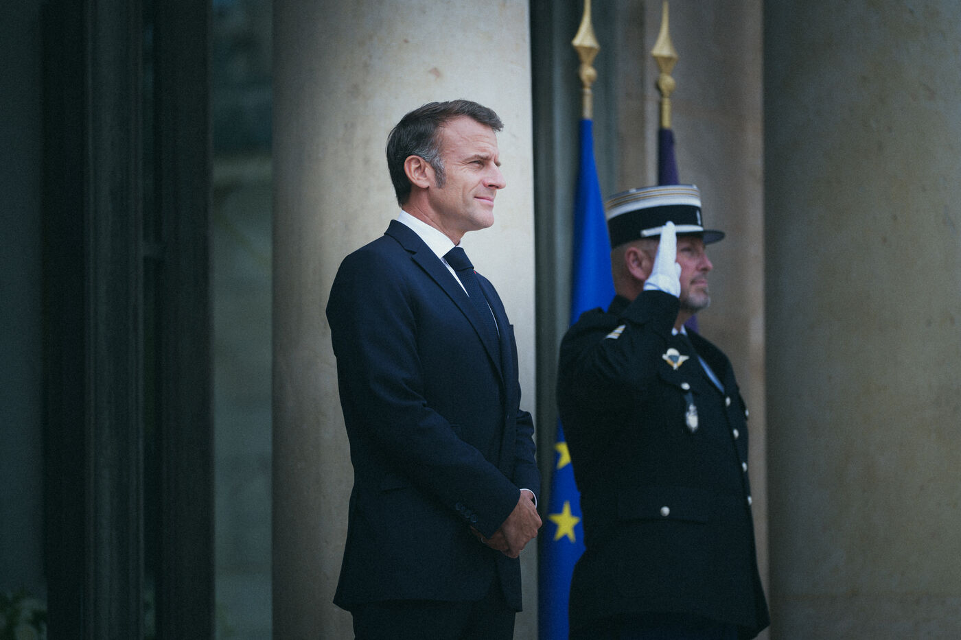 Emmanuel Macron president of France welcomes Jotham NAPAT Prime Minister of the Republic of Vanuatu at the Elysee Palace in Paris France on 23 July 2025