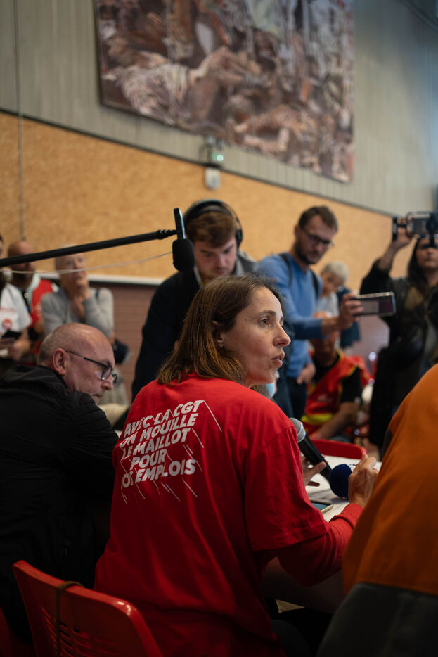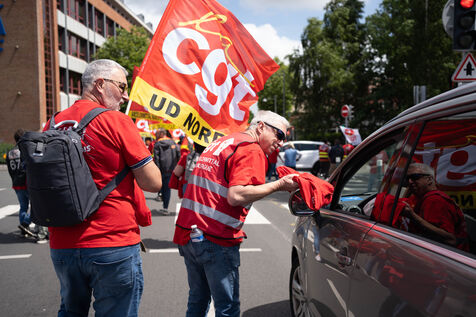 Manifestation des salariés Arcelor Mittal de Dunkerque lors de la 3ème étape du Tour de France. Un rassemblement populaire pour et festive à l'initiative de la CGT pour défendre les emplois de la sidérurgie.