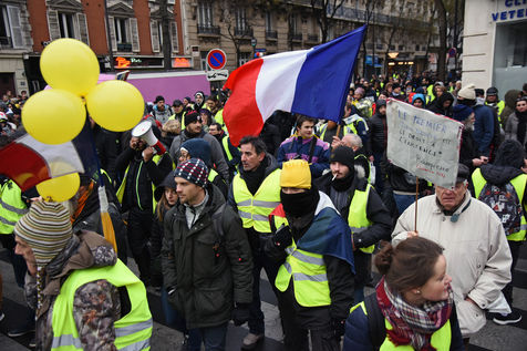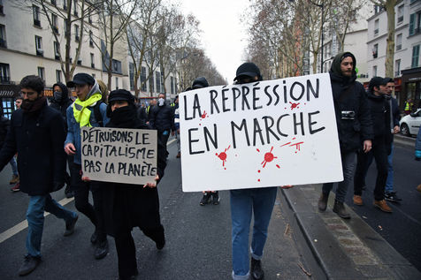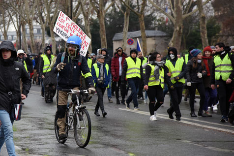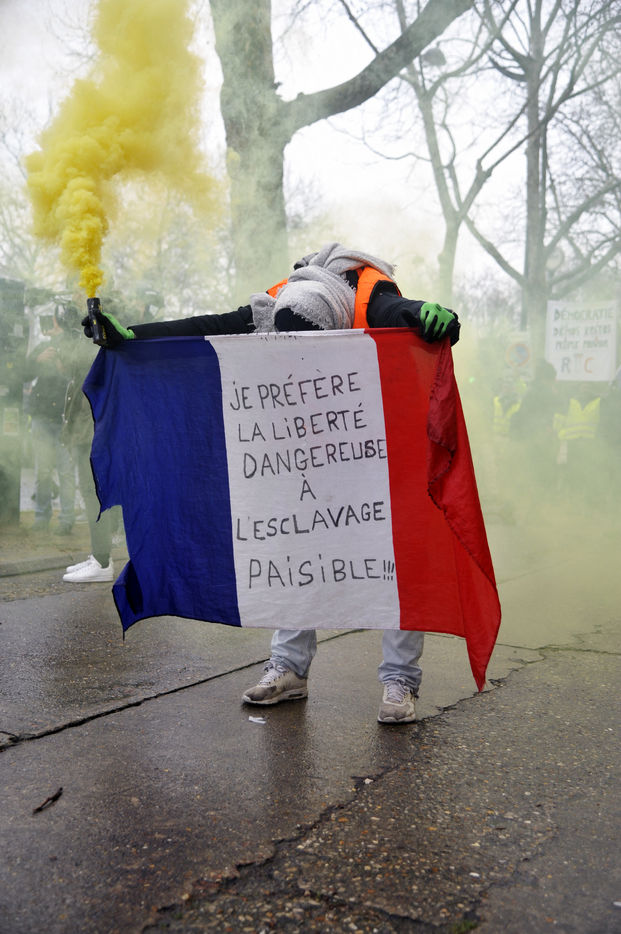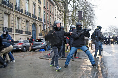 French yellow vests (Gilets jaunes) protesters clash with French riot police during demonstration against deteriorating economic conditions around Invalides Square in Paris, France on January 19, 2019.