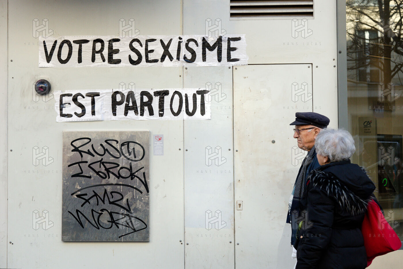 Collages dans les rues dénonçant les féminicides et les violences faites aux femmes à Paris.