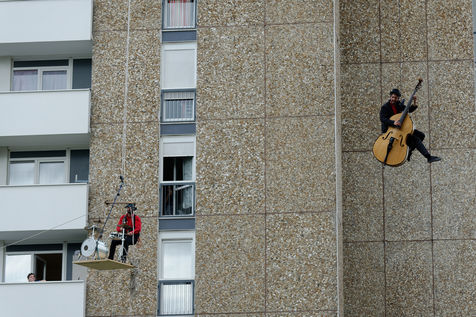 A poetic and spectacular show by the company Les Têtes Bêches on the facade of a 20-storey building in the Sentes district of Les Lilas, accompanied by live music. Born in 2013 in Marseille, the Compagnie Les Têtes Bêches specialises in all-terrain aerial acrobatics, mixing circus techniques, vertical dance, acrobatics and climbing. Their creations are strongly inspired by the location and are readapted for each performance.