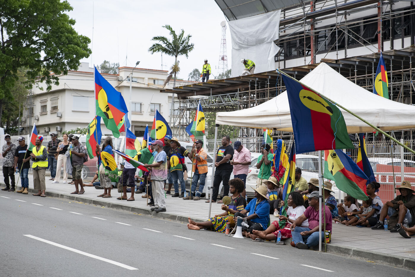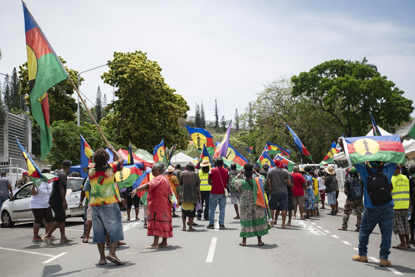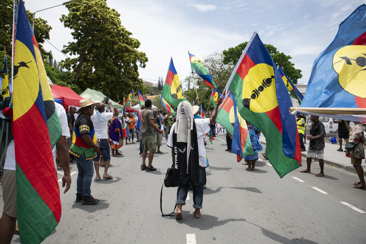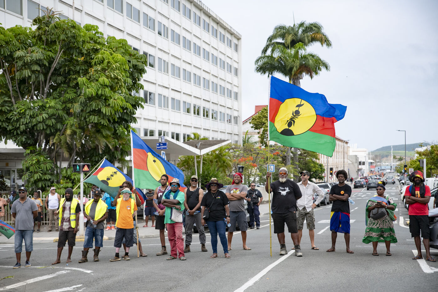 Les militants et sympathisants de la Cellule de Coordination des Actions Terrain (CCAT) se mobilisent devant le Haut-commissariat dans le centre-ville de Nouméa, suite à la validation du report des élections provinciales et à l’avis favorable du Conseil d’État sur le projet de loi constitutionnelle lié à l’accord de Bougival.