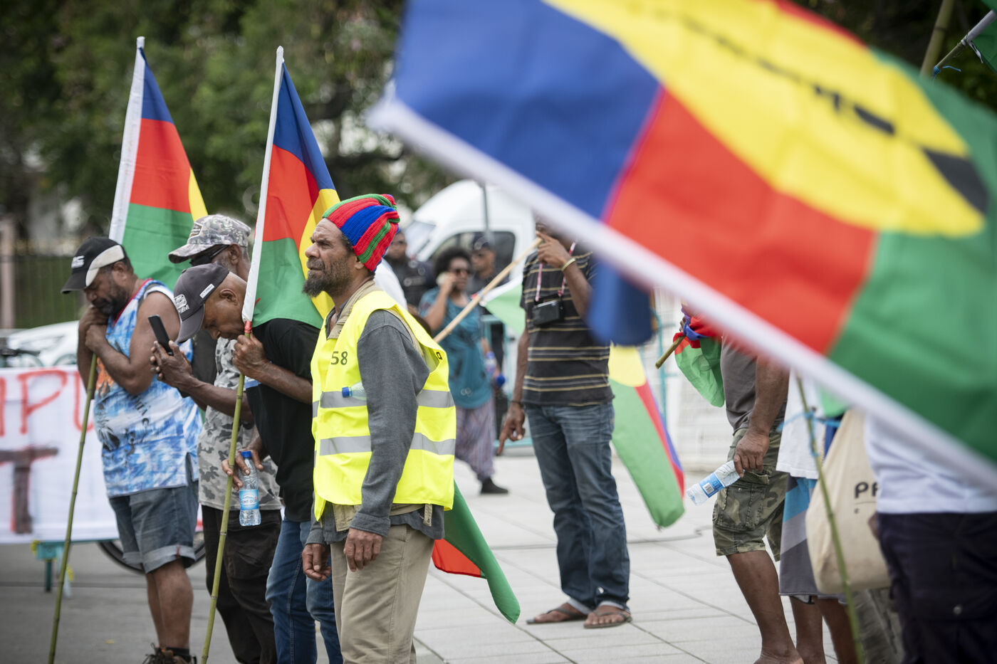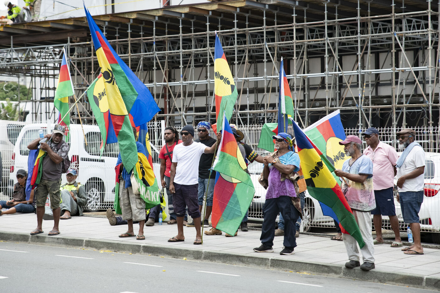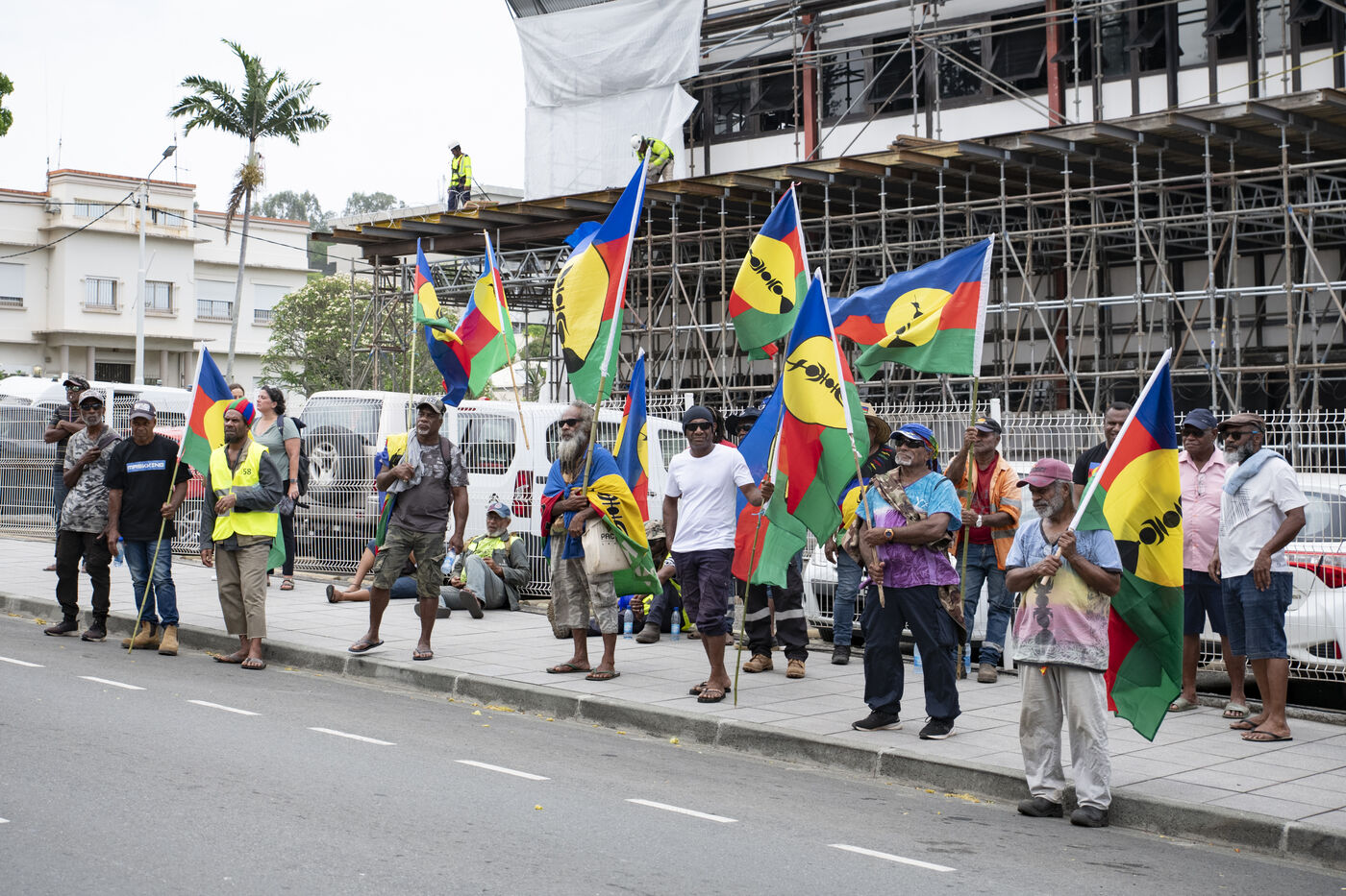 Les militants et sympathisants de la Cellule de Coordination des Actions Terrain (CCAT) se mobilisent devant le Haut-commissariat dans le centre-ville de Nouméa, suite à la validation du report des élections provinciales et à l’avis favorable du Conseil d’État sur le projet de loi constitutionnelle lié à l’accord de Bougival.