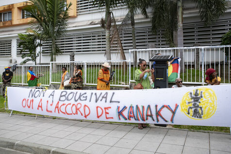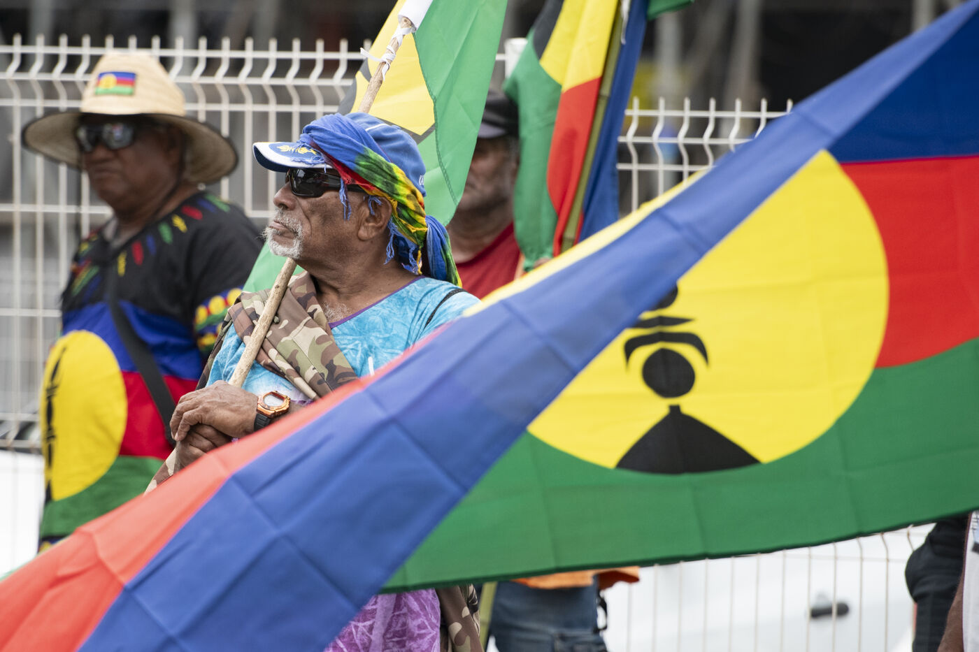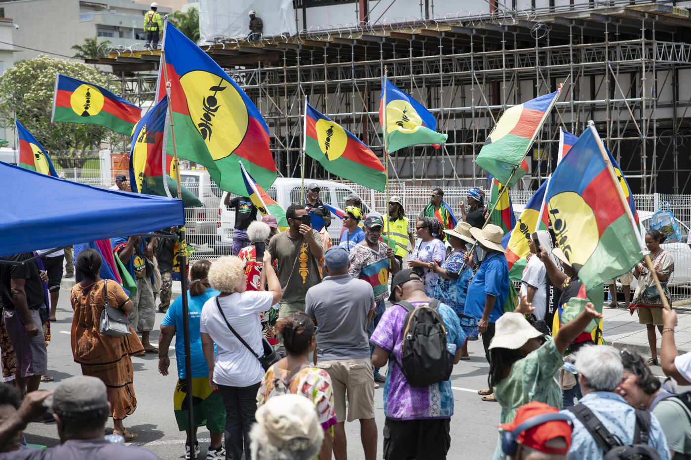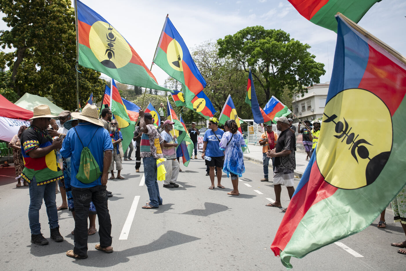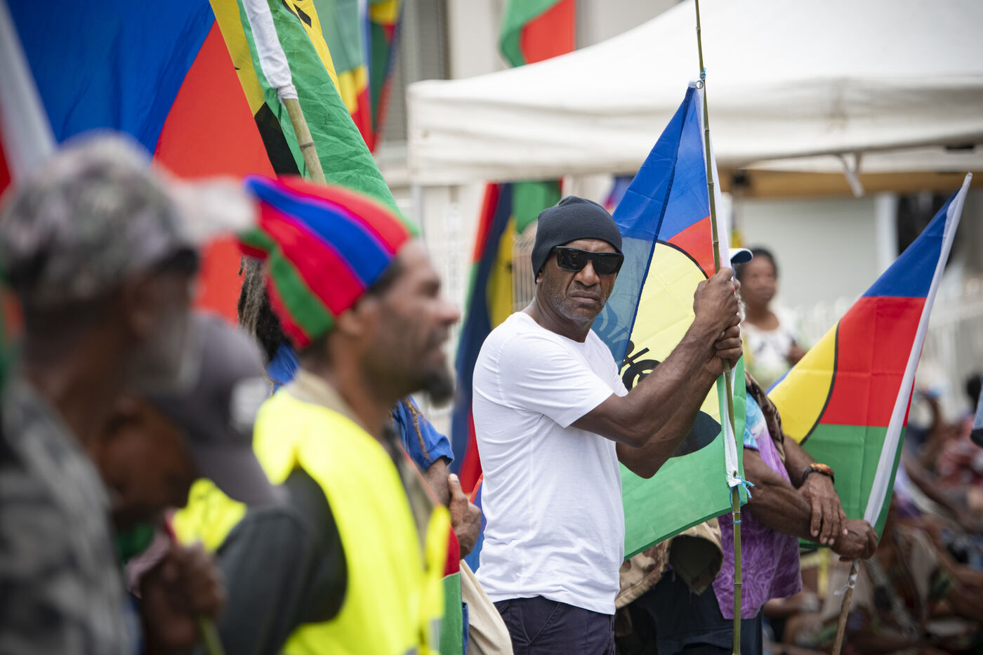 Les militants et sympathisants de la Cellule de Coordination des Actions Terrain (CCAT) se mobilisent devant le Haut-commissariat dans le centre-ville de Nouméa, suite à la validation du report des élections provinciales et à l’avis favorable du Conseil d’État sur le projet de loi constitutionnelle lié à l’accord de Bougival.