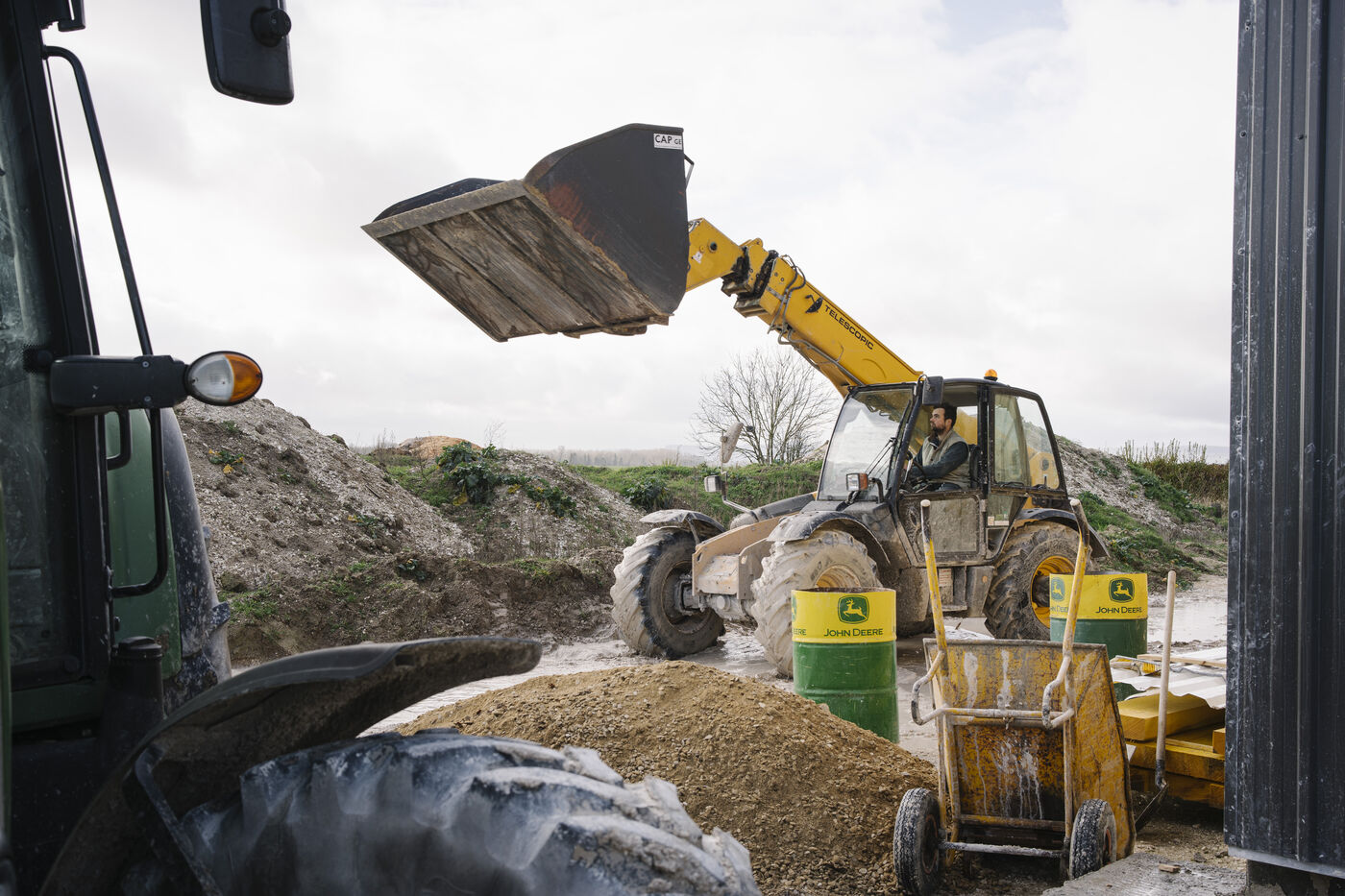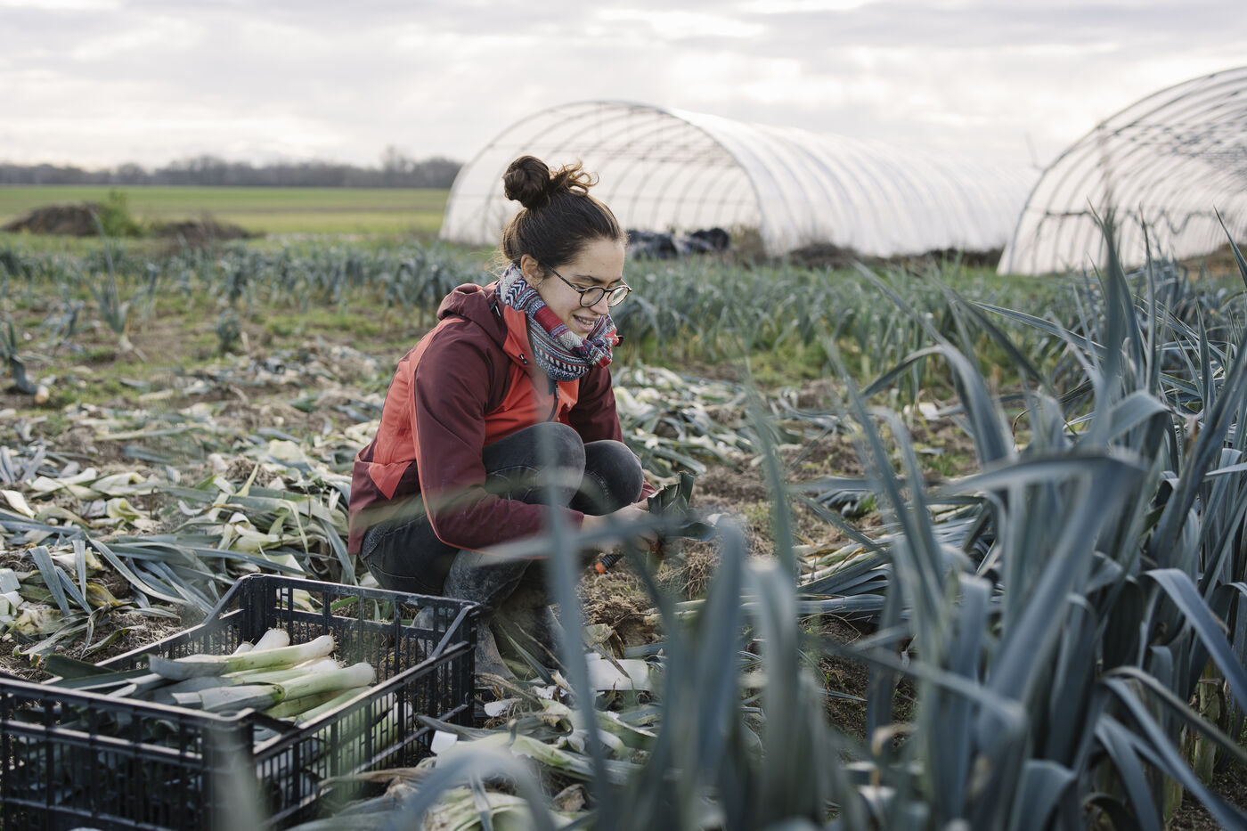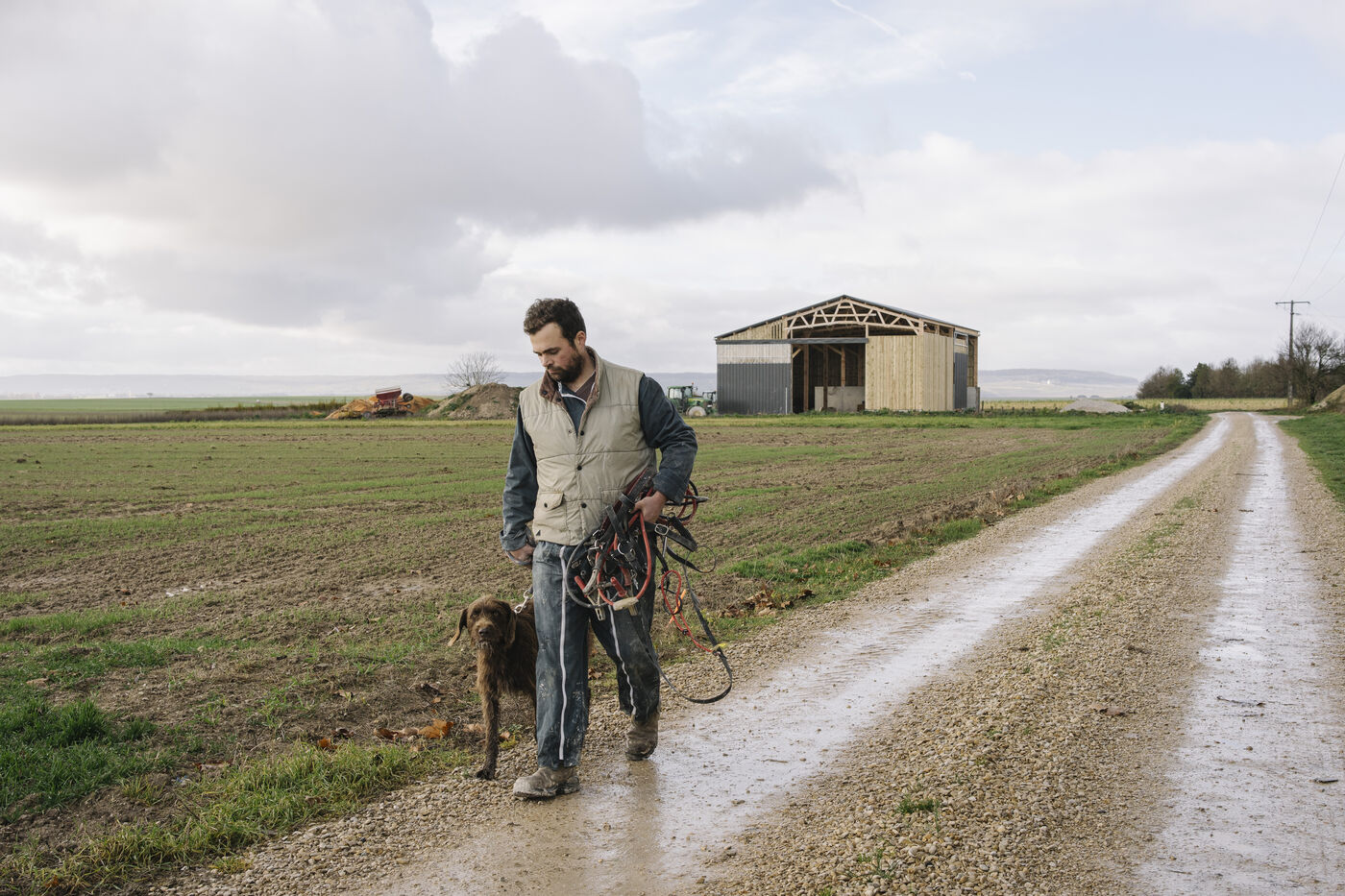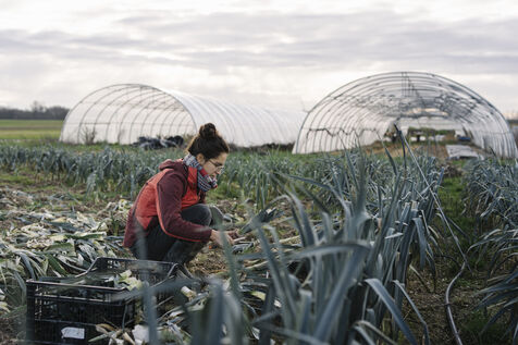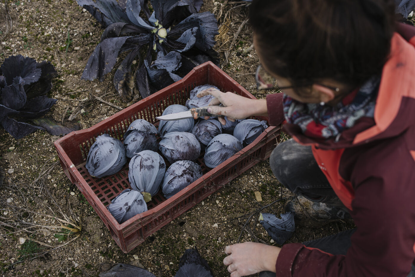 France, Athis, 2023-12-13. Alexia and Pierre-Edouard have started growing their vegetables under cover and in the open field, without chemical fertilisers or pesticides, on a plot of land in its third year of conversion to organic farming. Their vegetable plot is tilled using animal traction with their mare Charlotte.