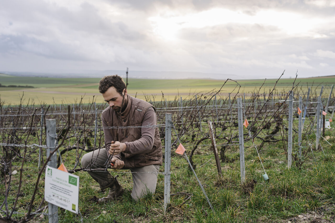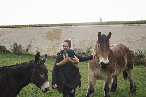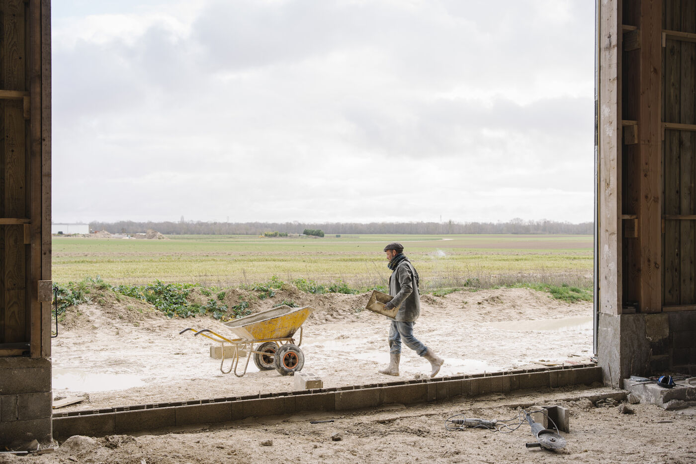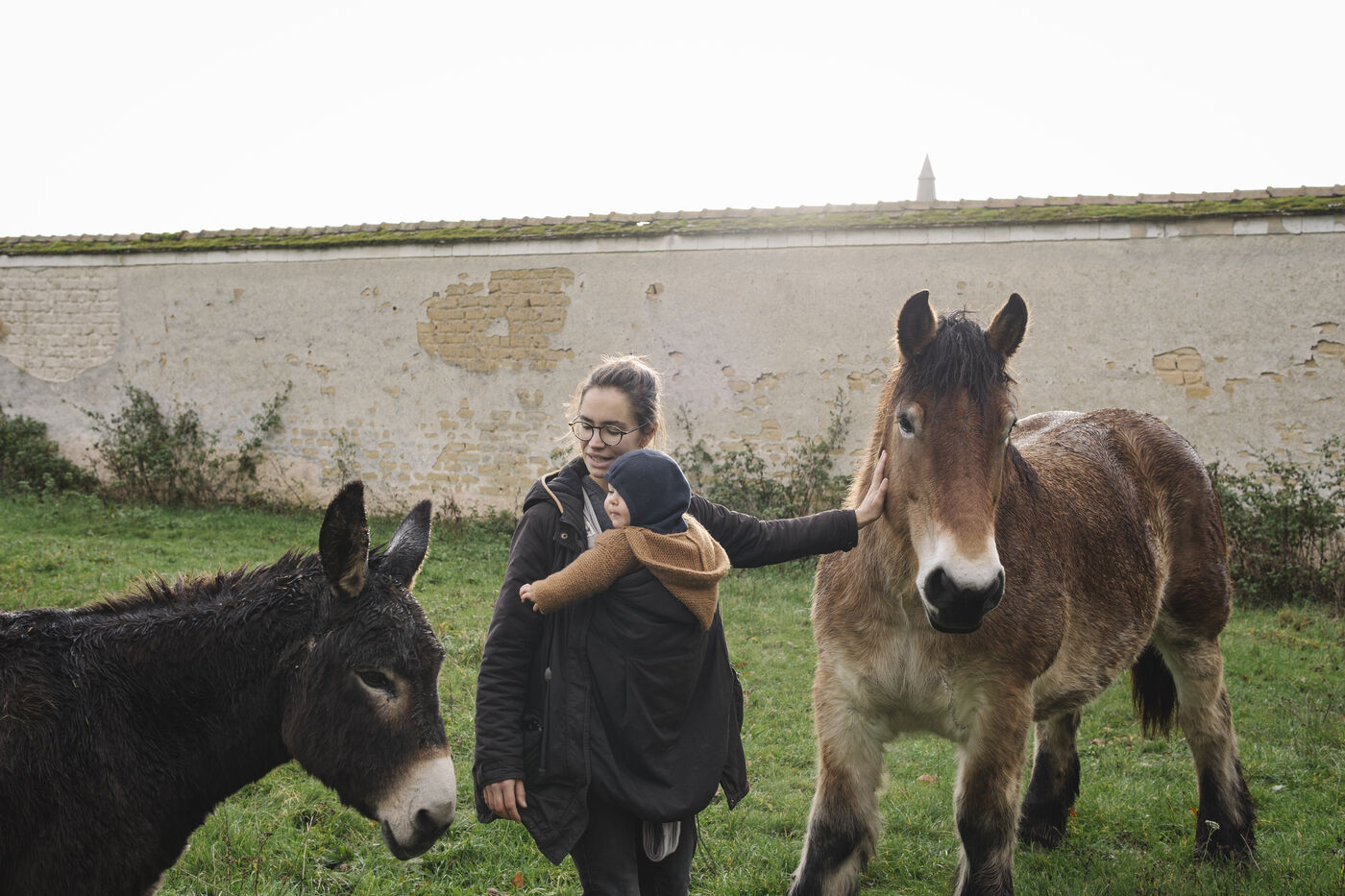 France, Athis, 2023-12-13. Alexia and Pierre-Edouard have started growing their vegetables under cover and in the open field, without chemical fertilisers or pesticides, on a plot of land in its third year of conversion to organic farming. Their vegetable plot is tilled using animal traction with their mare Charlotte.