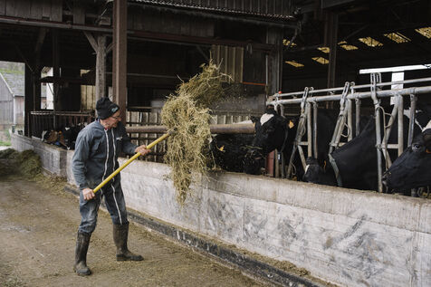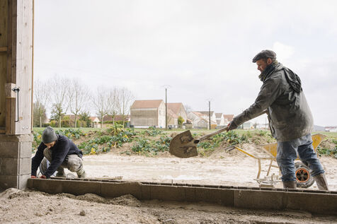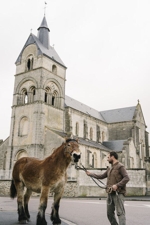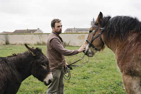 France, Athis, 2023-12-13. Alexia et Pierre-Edouard ont démarré produisent sous abris et en plein champ leurs légumes sans engrais chimiques ni pesticides, sur une parcelle en troisième année de conversion vers l'agriculture biologique. Le travail du sol de la parcelle de maraichage est effectué à l'aide de la traction animale avec leur jument Charlotte.