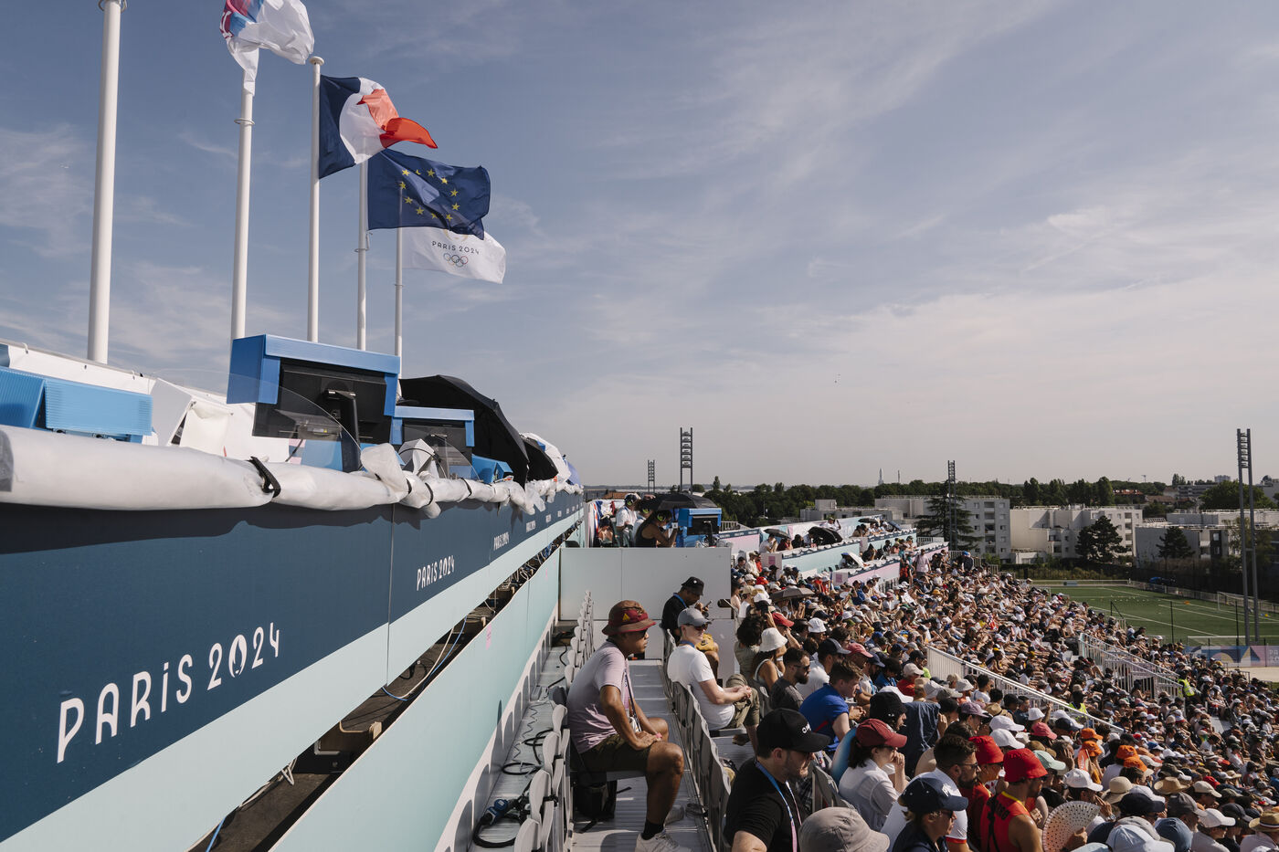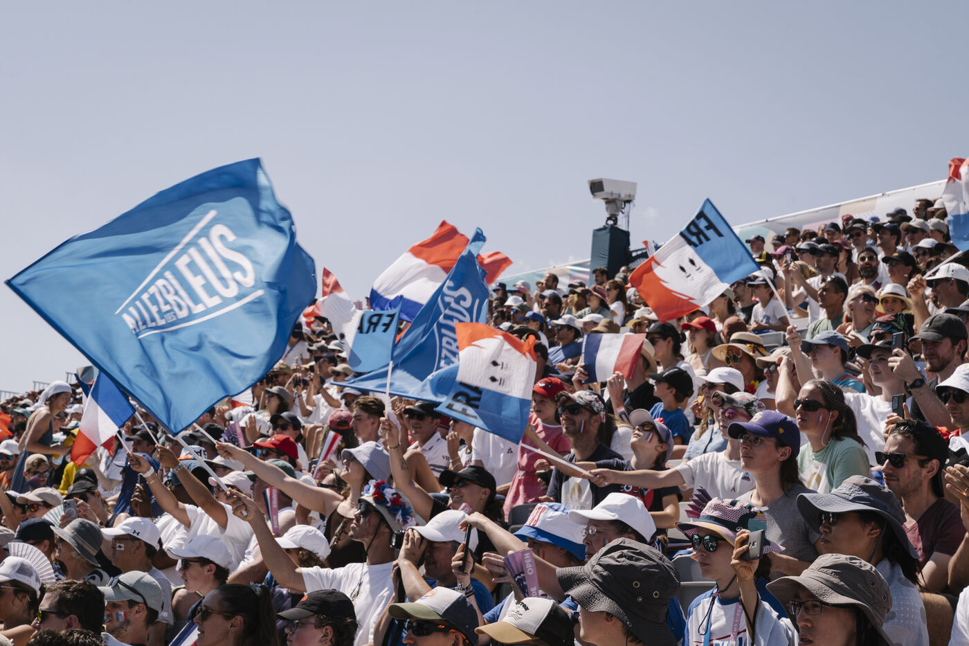 France, Le Bourget, 2024-08-06. Sport climbing event at the Le Bourget climbing site, supporters and infrastructure of the Olympic district, as part of the Paris 2024 Olympic Games.