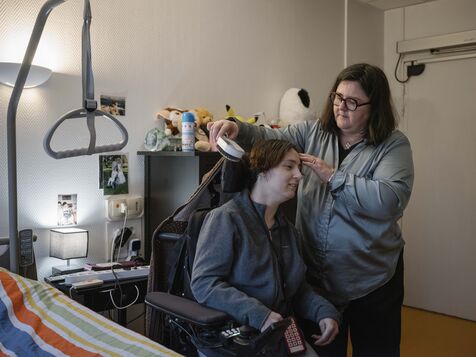 Laure Senemaud Herrera-Carriquiry, sage-femme, anime un atelier au Foyer d'Accueil Médicalisé APF, dans le cadre de la démarche Handigynéco, un parcours de soins gynécologiques dédié aux femmes en situation de handicap accueillies dans des établissements médico-sociaux (ESMS) médicalisés (FAM-MAS) et porté par l’ARS Île-de-France depuis 2023.
