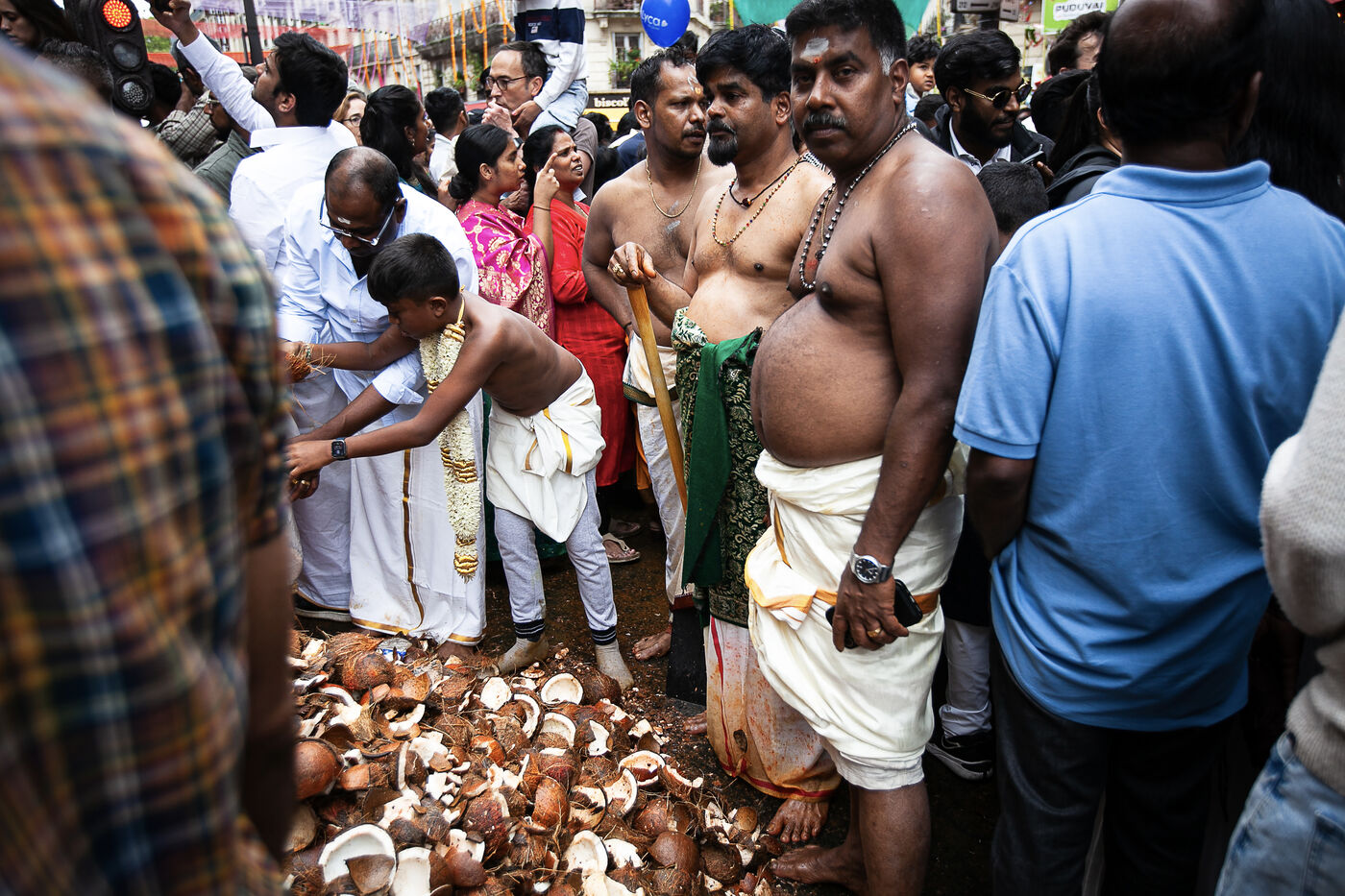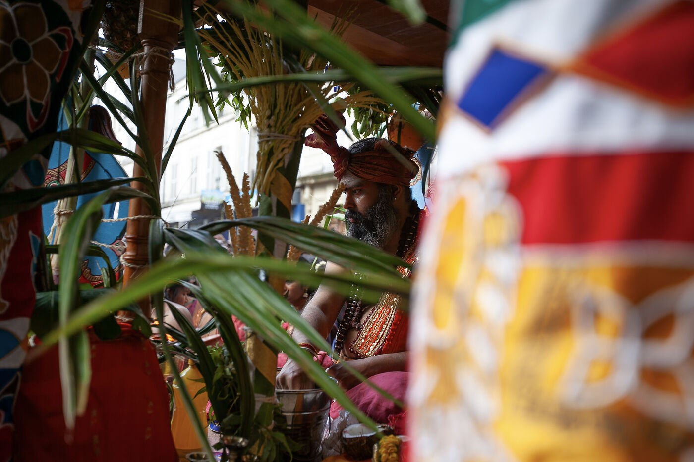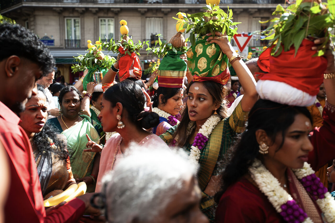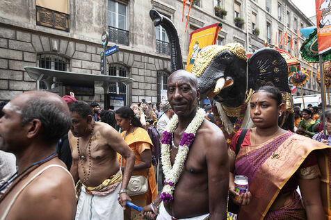 Ganesh, the Hindu god with a human body and an elephant's head, is celebrated every year in the streets of Paris. He brings good fortune to the faithful. The community departs from the temple dedicated to Ganesh in the 18th arrondissement of Paris and travels through the neighborhood during a Sunday of sharing and celebration for thousands of participants in the procession.