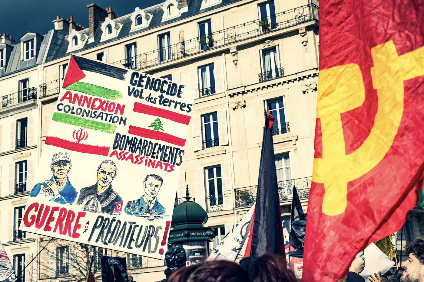 Une manifestation antifasciste antiraciste et antisioniste a été organisée par des collectifs activistes à Paris. Parmis les slogans, des slogans anti américains et contre la guerre voisinaient des slogans et des miltants anti-Israël prenant la défense de la Palestine et de l'Iran contre la guerre.