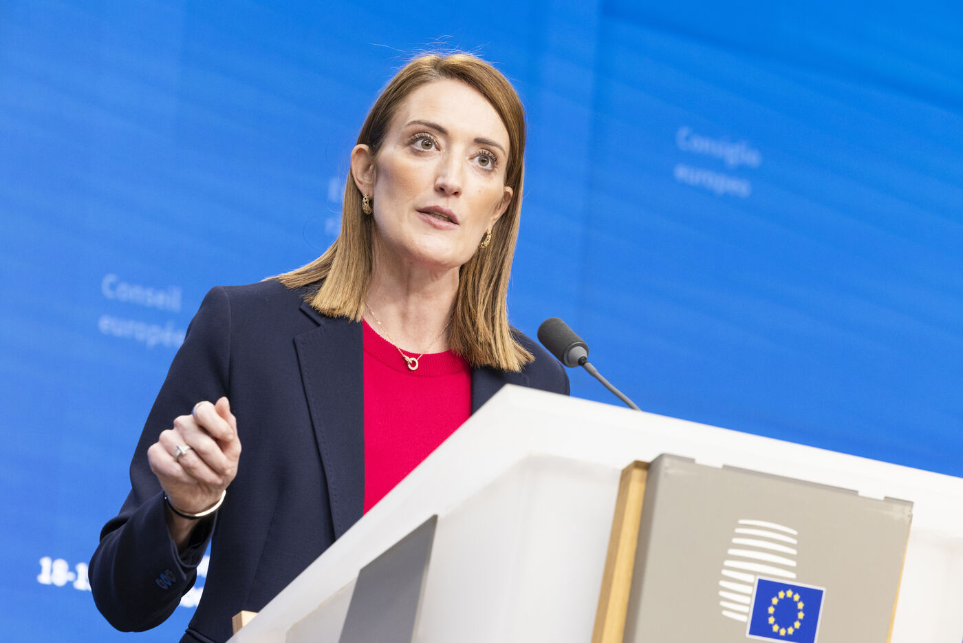 European leaders speak to the media during press conferences or talk together during the opening tour de table at the European Council meeting in Brussels on 18 December 2025.