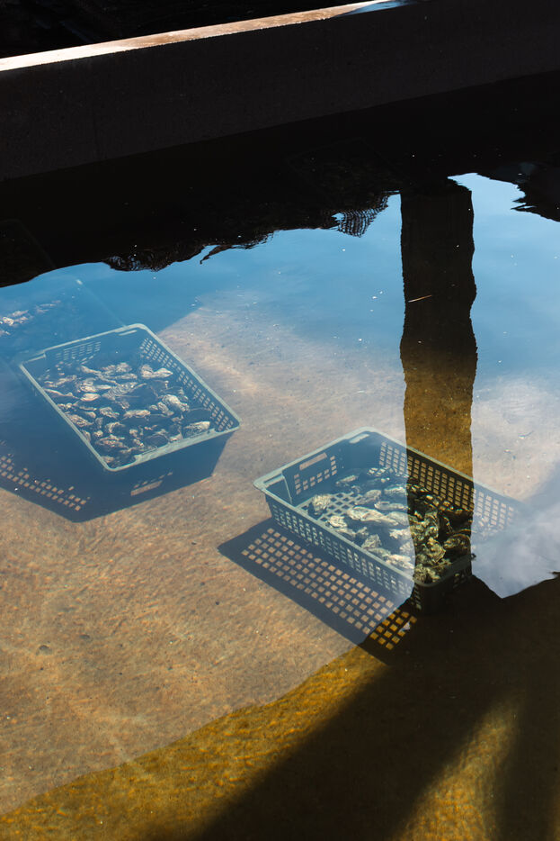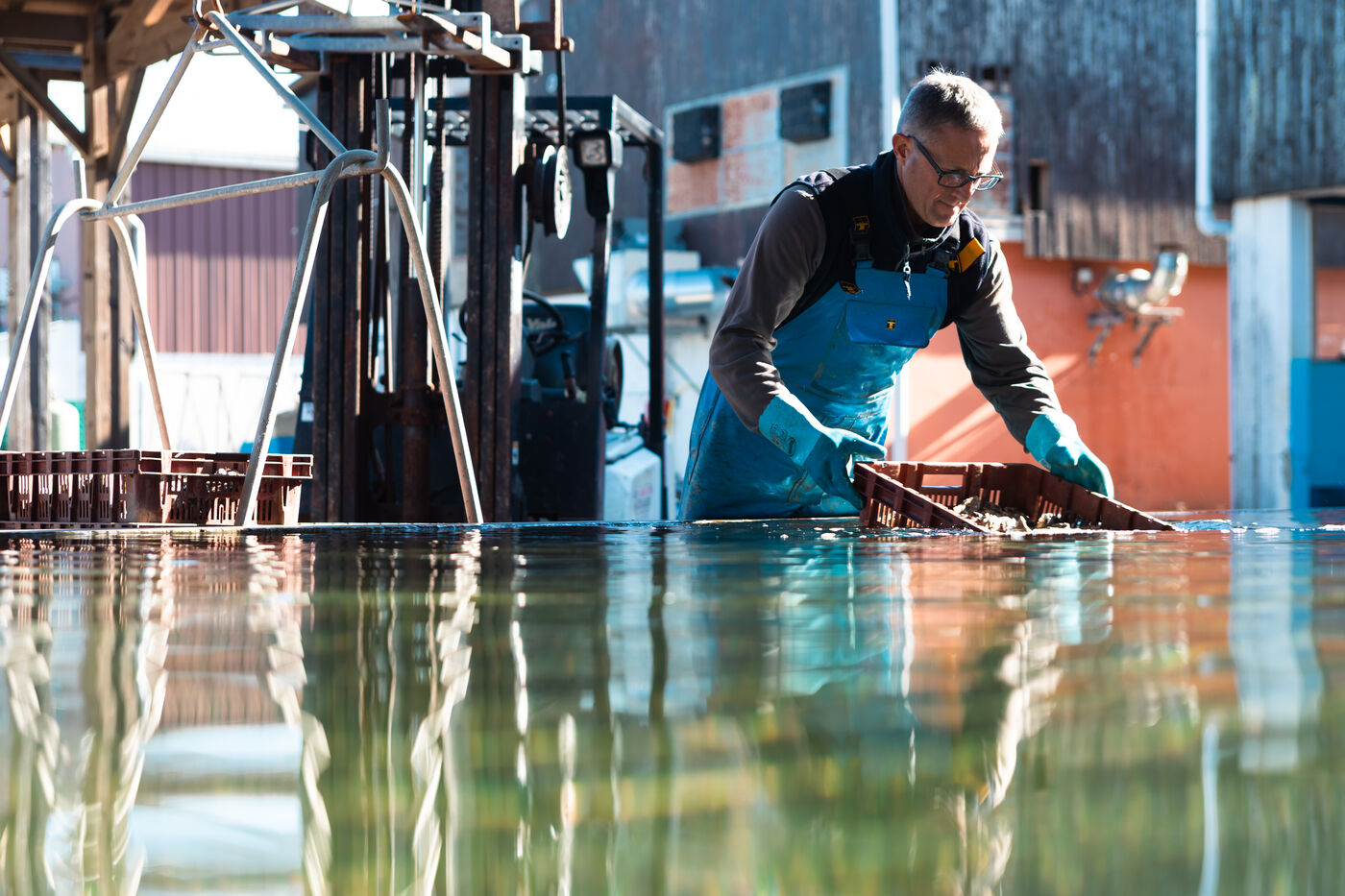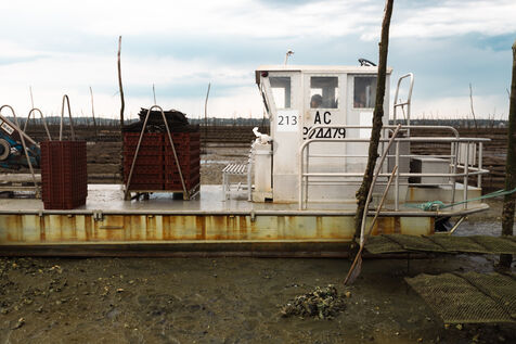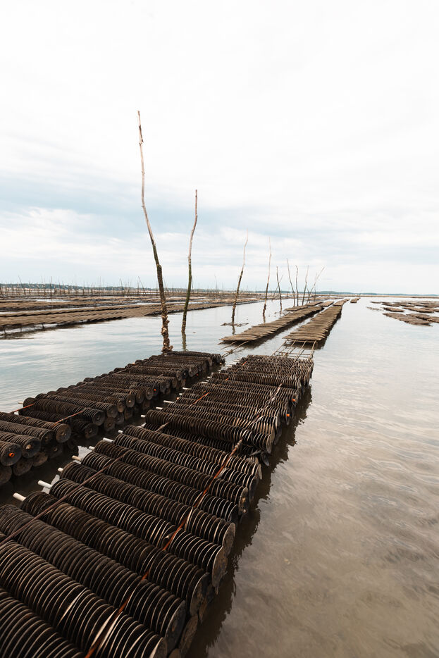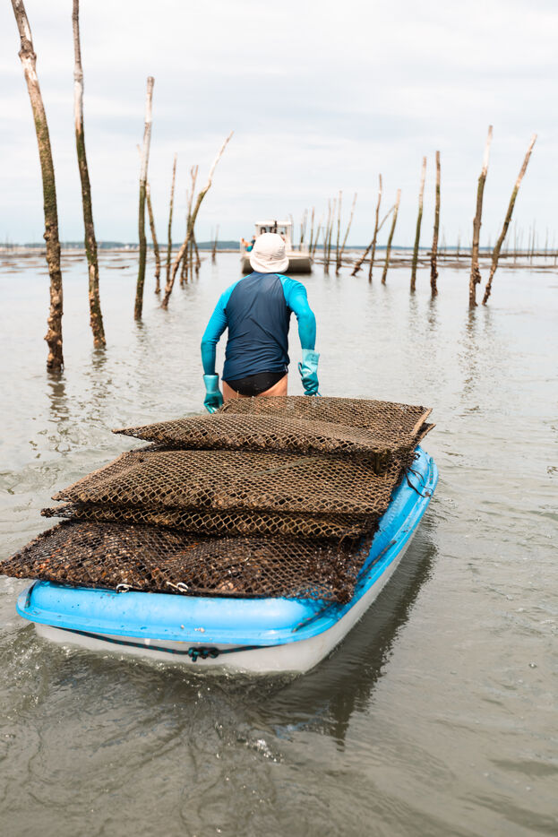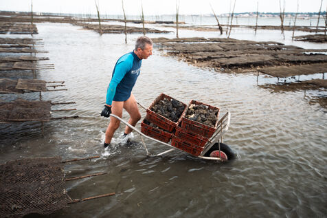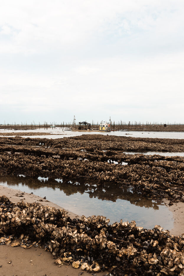 Philippe Bos, an oyster farmer for four generations in the Arcachon Basin, works on his oyster beds in tune with the tides. After nearly forty years in the business, he speaks of the growing difficulties facing oyster farming: water pollution, health bans, and labor shortages, particularly as the holiday season approaches, a key period for the industry. As his children did not wish to take over the business, the Banc d'Arguin and Courbey farms are now run by Fréderic Simon and his son Luca.