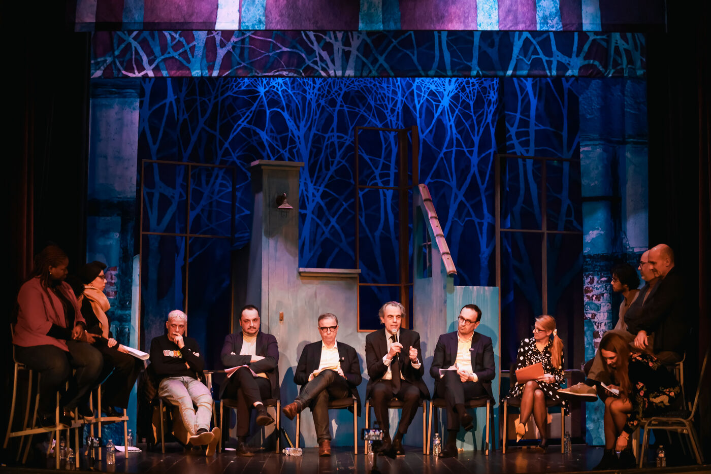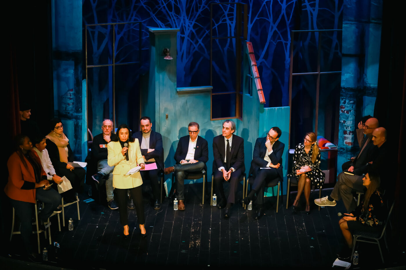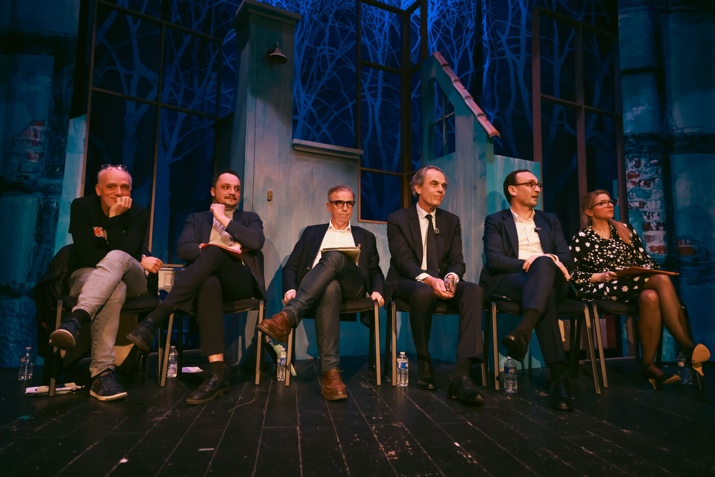 Public debate organized by the International Research Chair “Inclusiveness and Health,” University of Bordeaux, led by sociologist Yamina Meziani from the University of Bordeaux, bringing together, from left to right, Philippe Poutou, Nordine Raymond, Pierre Hurmic, Philippe Dessertine, Thomas Cazenave, and Virginie Bonthoux-Tournay; candidates for the 2026 municipal elections in the city of Bordeaux, France. Public debate during which Yves Simone, an independent candidate, expressed his dissatisfaction at not being allowed to participate in the debate on stage.