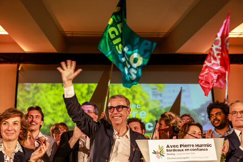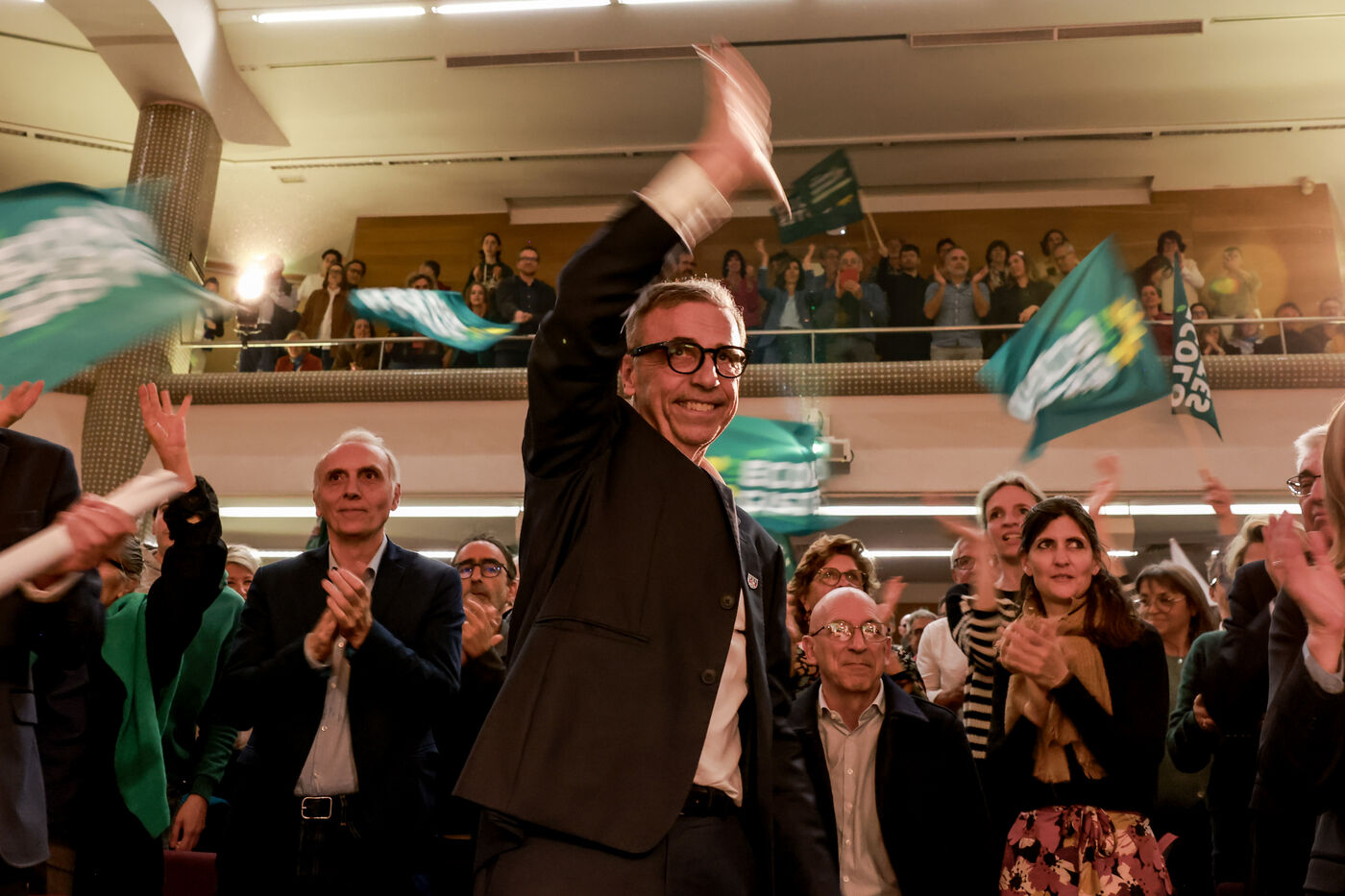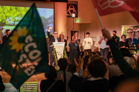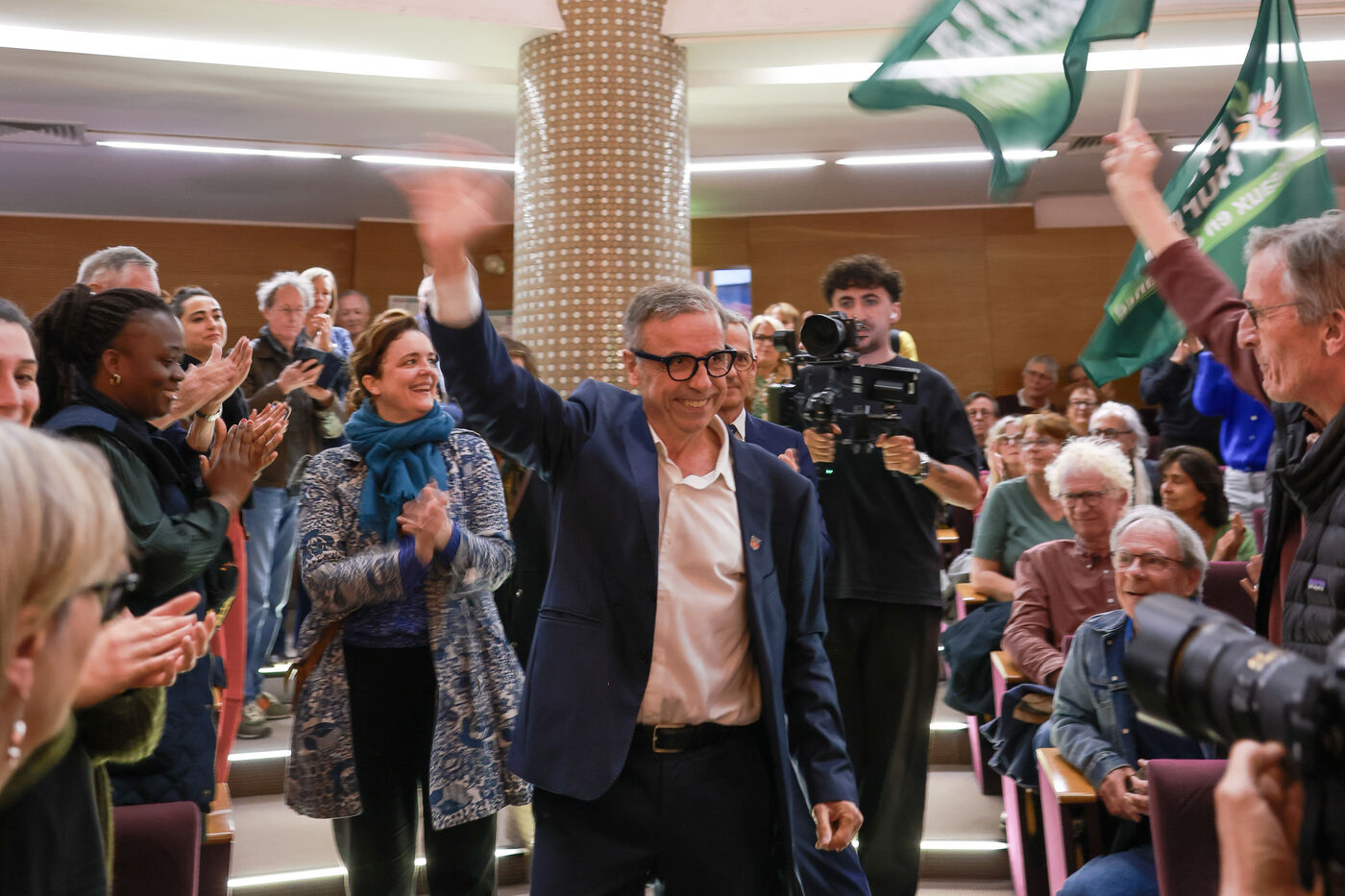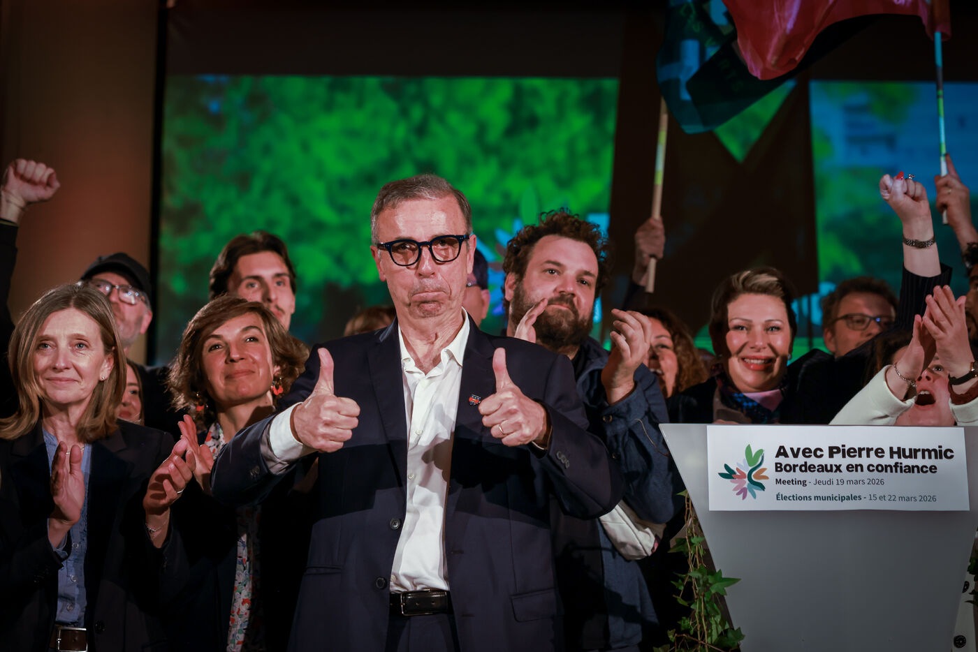 Pierre Hurmic, the incumbent mayor of Bordeaux, addressed the crowd at the municipal auditorium, surrounded by his supporters, during his final campaign rally for the 2026 municipal elections