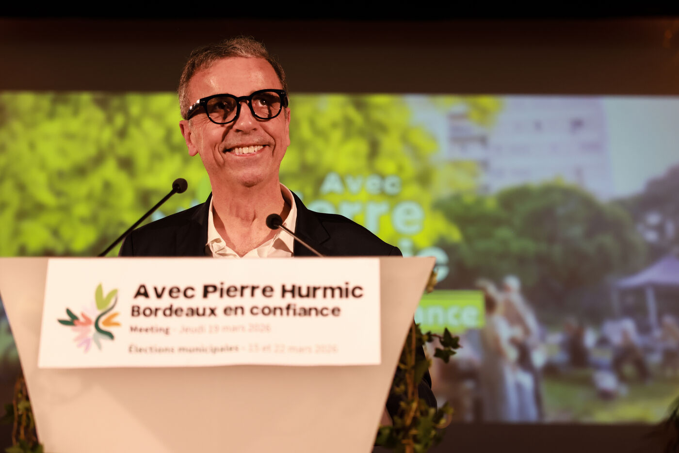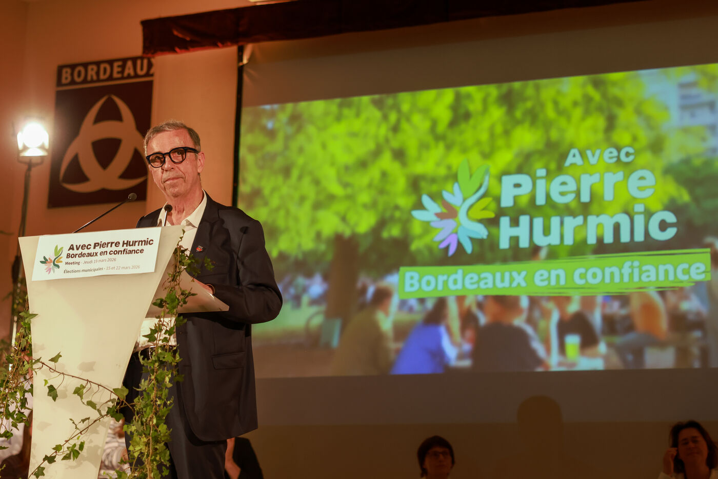 Pierre Hurmic, maire sortant de la ville de Bordeaux prend la parole à l’athénée municipal entouré de ses soutiens lors de son dernier meeting de campagne lors de la campagne des municipales 2026