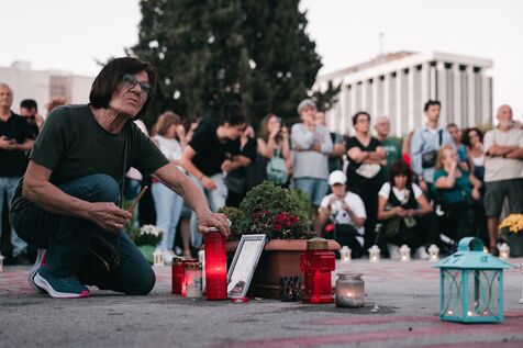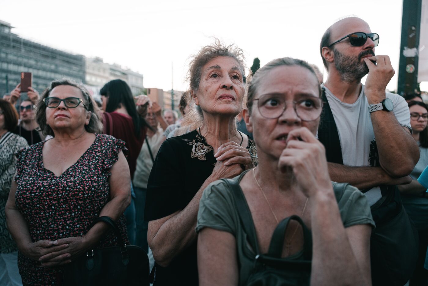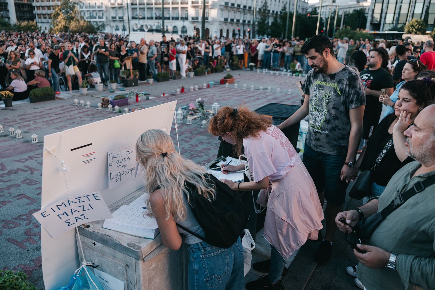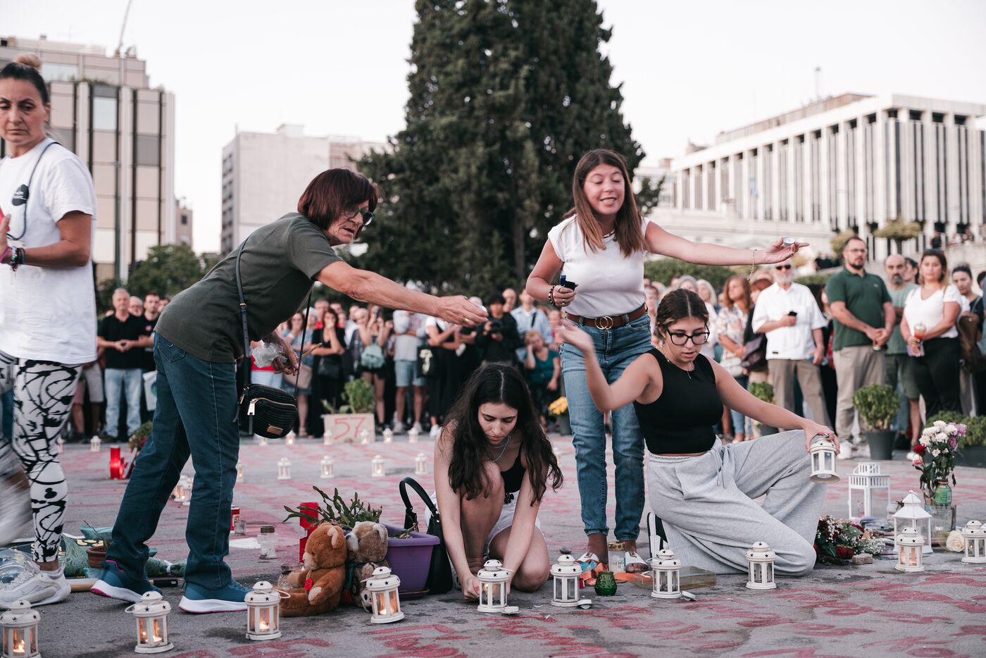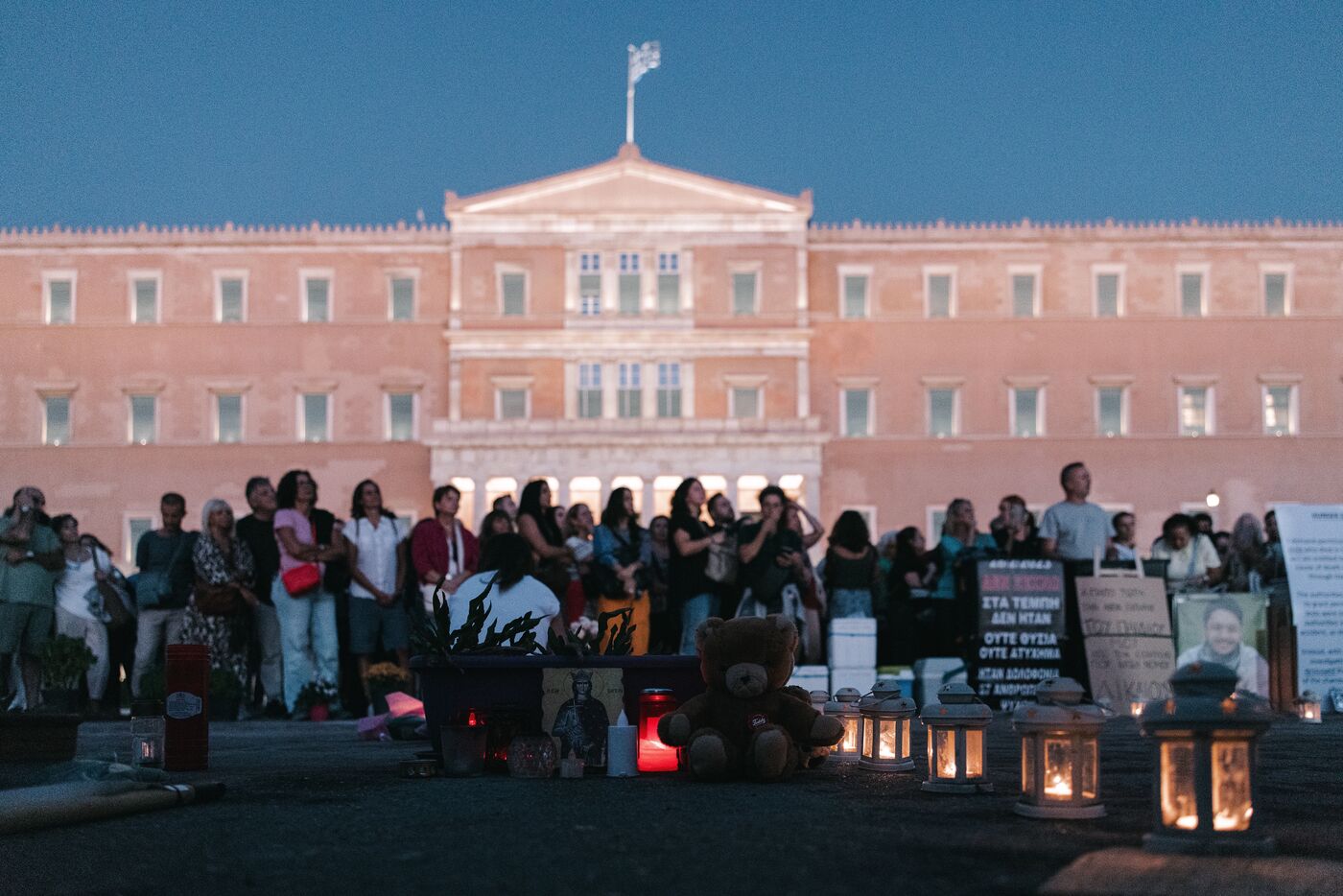 People gathered at Syntagma Square in Athens in solidarity with P Routsis and the victims of the Tempi train crash, holding banners, lighting candles, and listening to speeches. The event marks the seventh day of P Routsis’s hunger strike as families are not allowed to bury the victims because the government keeps the bodies as evidence for the investigation in Athens, Greece on September 21, 2025.