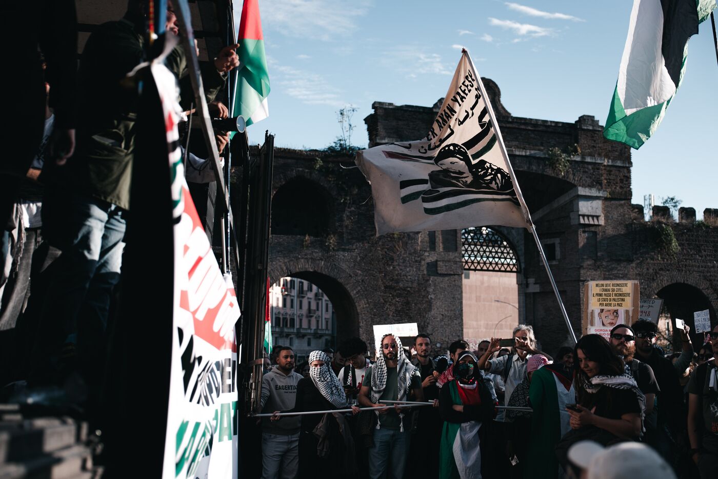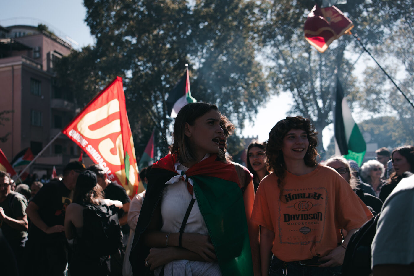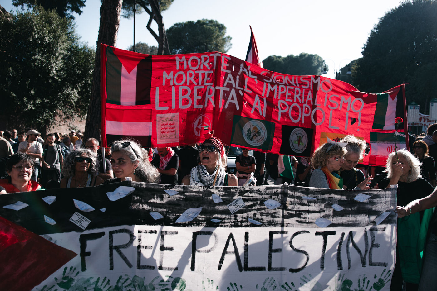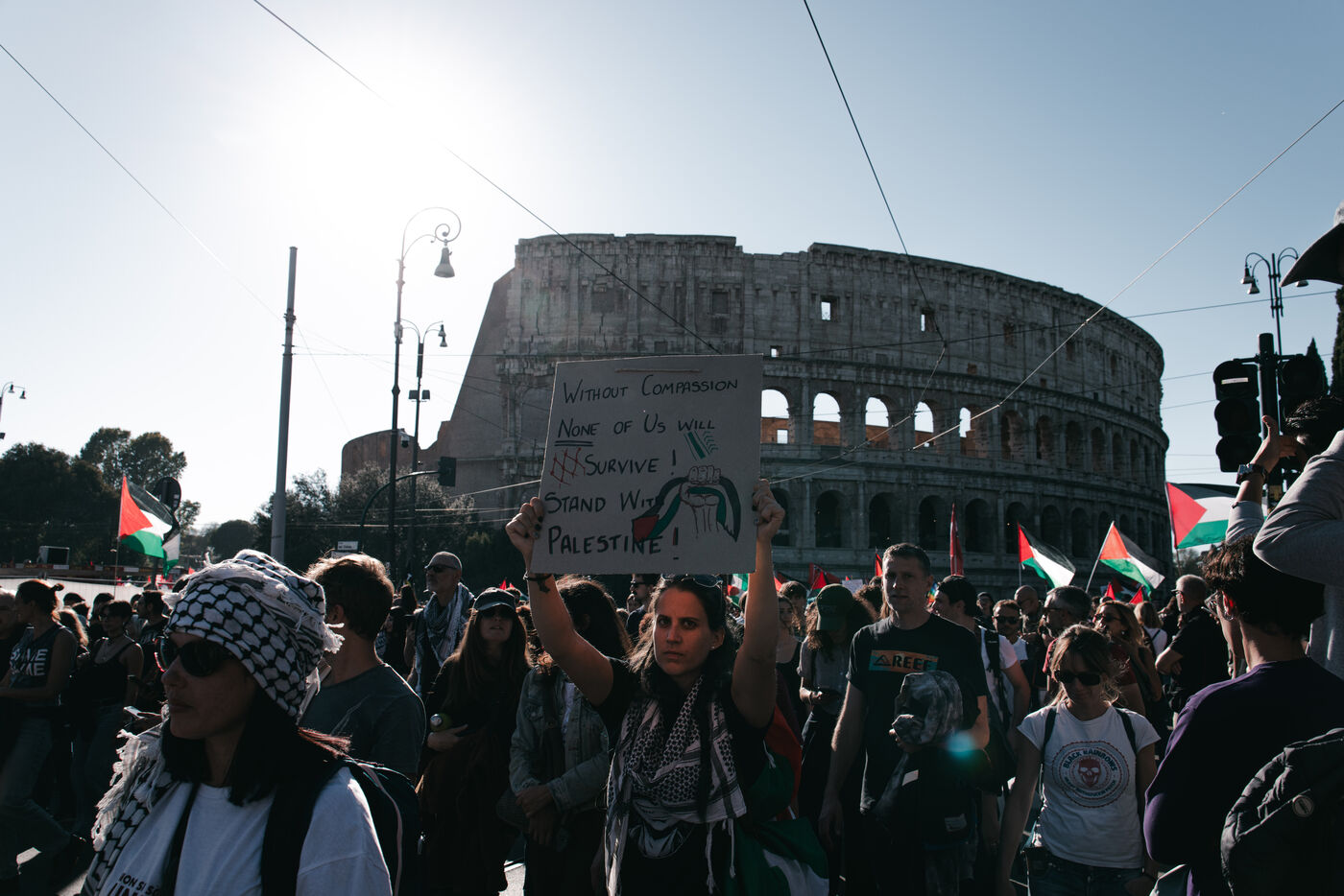 An estimated tens of thousands of people took part in pro-Palestinian demonstrations in Rome on October 4, 2025. Organized with the support of major Italian unions after a nationwide general strike, the marches follow Israel’s interception of the Global Sumud aid flotilla bringing supplies to Gaza. Protesters waved Palestinian and union flags, carried banners and posters, and marched through central landmarks including the Colosseum and San Giovanni in Laterano, temporarily affecting traffic and public transportation.