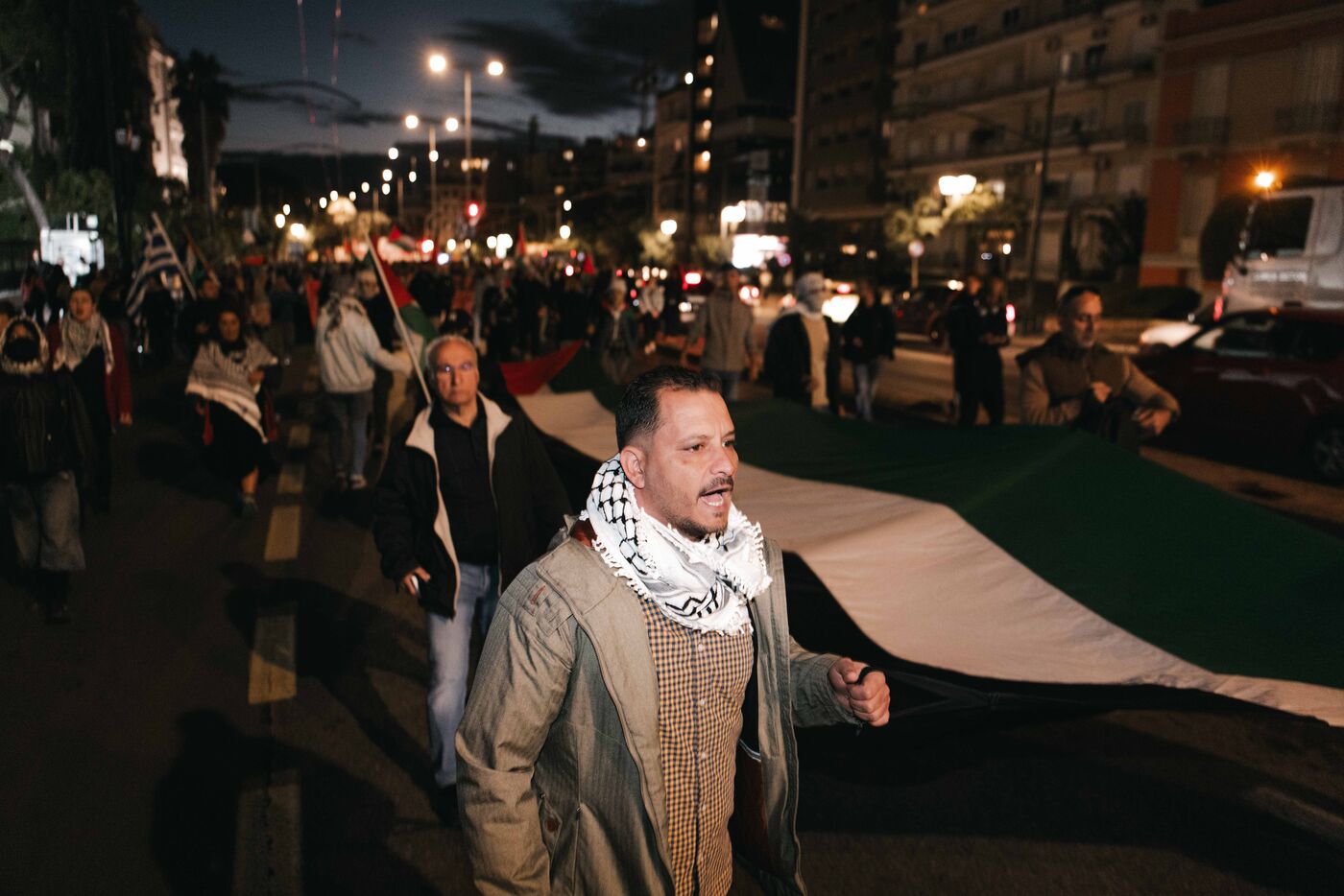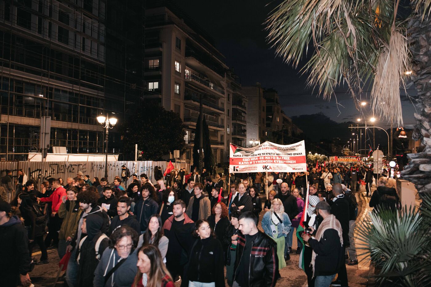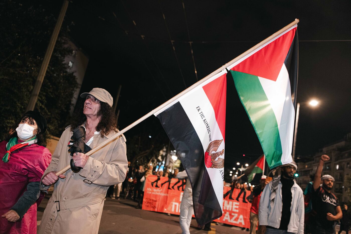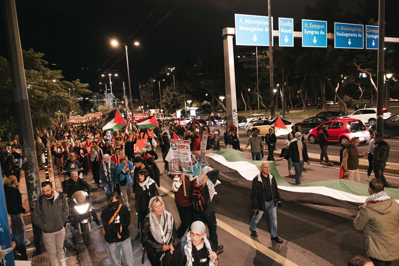 Thousands of pro-Palestinian demonstrators march through central streets, waving flags and holding banners near the Israeli and US embassies in Athens, Greece on October 7, 2025. The protest was organized by the Open Anti-Zionist Assembly, Palestinian Youth Movement, and other solidarity groups to mark two years since the start of the ongoing genocide in Palestine. Participants chanted slogans and expressed solidarity with the Palestinian people.