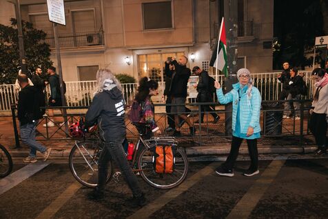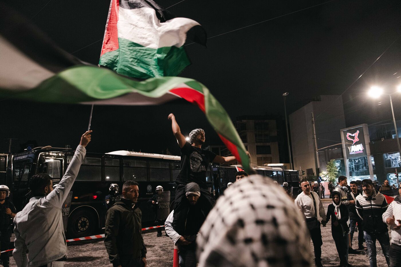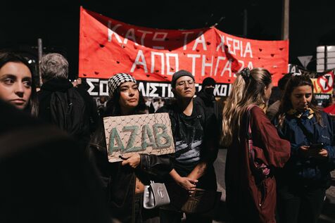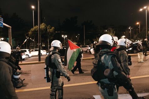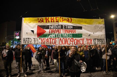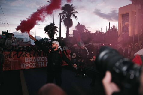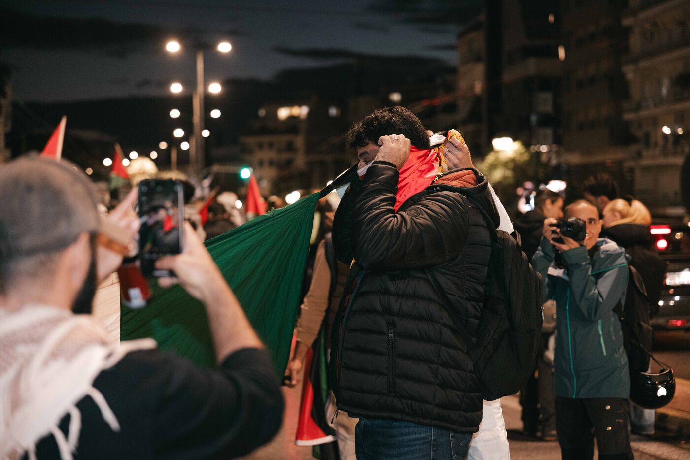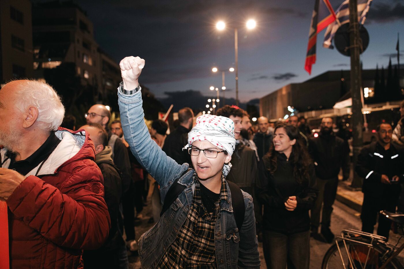 Thousands of pro-Palestinian demonstrators march through central streets, waving flags and holding banners near the Israeli and US embassies in Athens, Greece on October 7, 2025. The protest was organized by the Open Anti-Zionist Assembly, Palestinian Youth Movement, and other solidarity groups to mark two years since the start of the ongoing genocide in Palestine. Participants chanted slogans and expressed solidarity with the Palestinian people.
