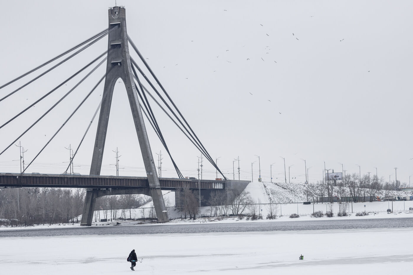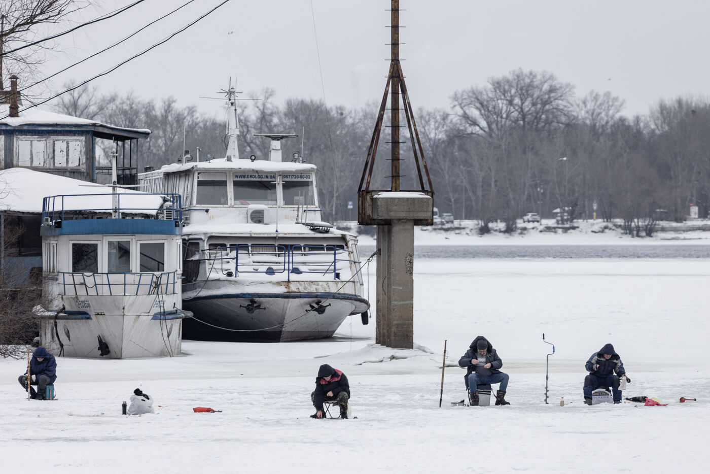 Kyiv experiences harsh winter conditions, yet daily life continues across the city on 30 January 2026. In Troieshchyna, temporary support tents provide electricity, heating, food, and internet. People fish on frozen sections of the river, while others wait at bus stops in the cold. Mobile deliveries of essential goods take place throughout the district. Streets, sidewalks, and public spaces are covered in snow and ice, with winter conditions affecting movement and routines. On Maidan, snow accumulates on the memorial of fallen soldiers, covering plaques and photographs. The scene captures multiple aspects of city life during extreme cold, from temporary support structures and outdoor activities to winter-covered memorials.
