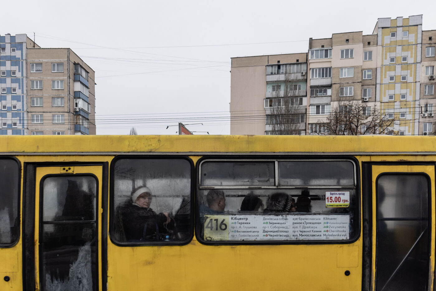 Kyiv traverse des conditions hivernales rigoureuses, mais la vie quotidienne se poursuit dans toute la ville le 30 janvier 2026. Dans le quartier de Troieshchyna, des tentes de soutien temporaires fournissent électricité, chauffage, nourriture et internet. Des personnes pêchent sur les parties gelées de la rivière, tandis que d’autres attendent aux arrêts de bus dans le froid. Des livraisons mobiles de produits essentiels sont effectuées dans tout le quartier. Les rues, les trottoirs et les espaces publics sont recouverts de neige et de glace, les conditions hivernales influençant les déplacements et les routines. Sur le Maidan, la neige s’accumule sur le mémorial des soldats tombés, recouvrant plaques et photographies. La scène capture plusieurs aspects de la vie urbaine pendant le froid extrême, des structures de soutien temporaires et des activités en extérieur aux mémoriaux recouverts de neige.