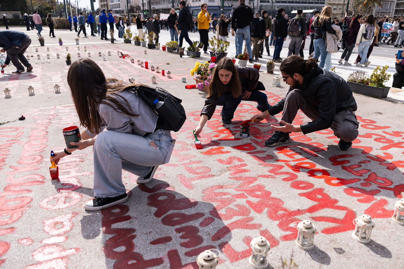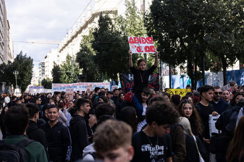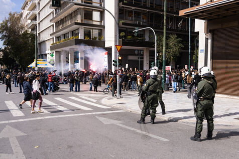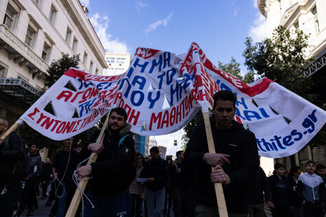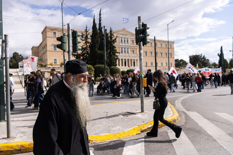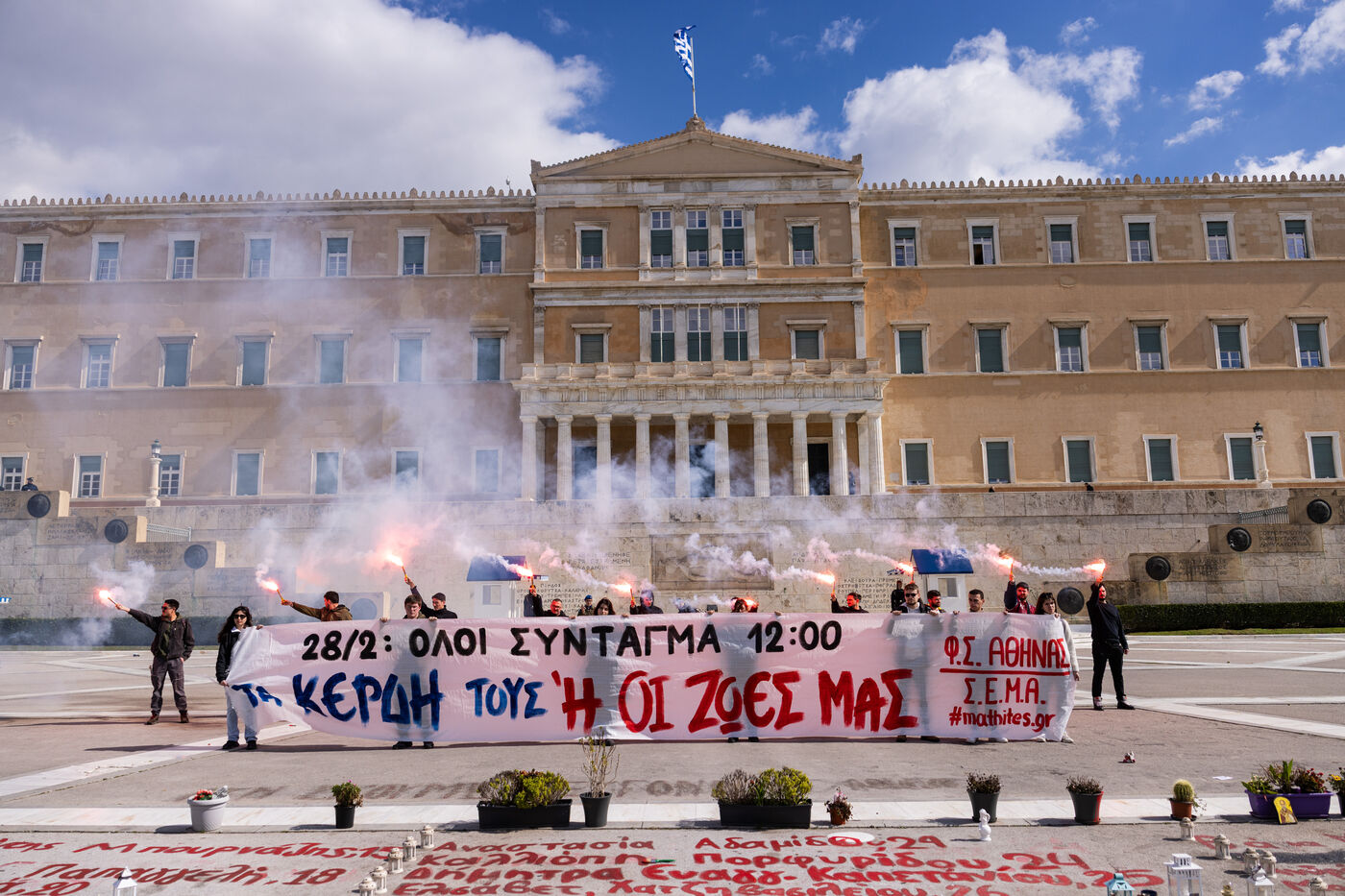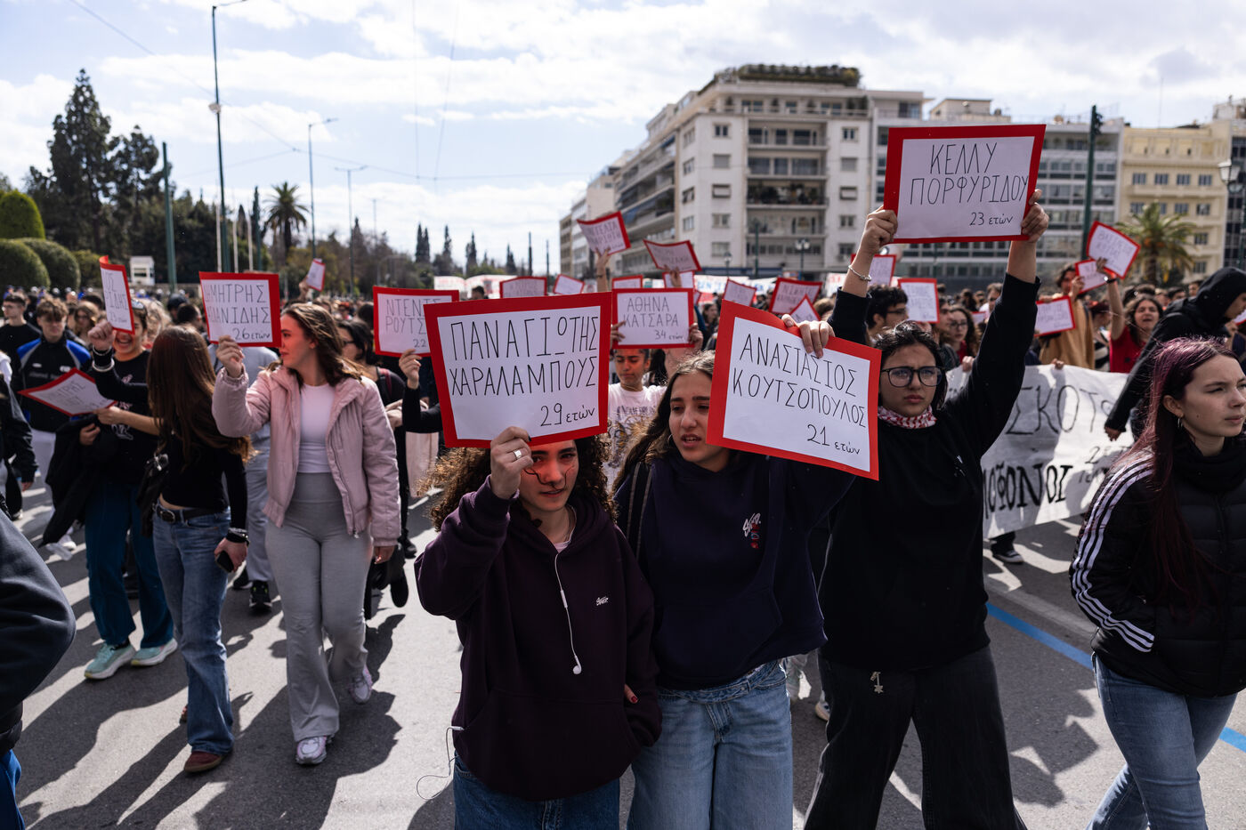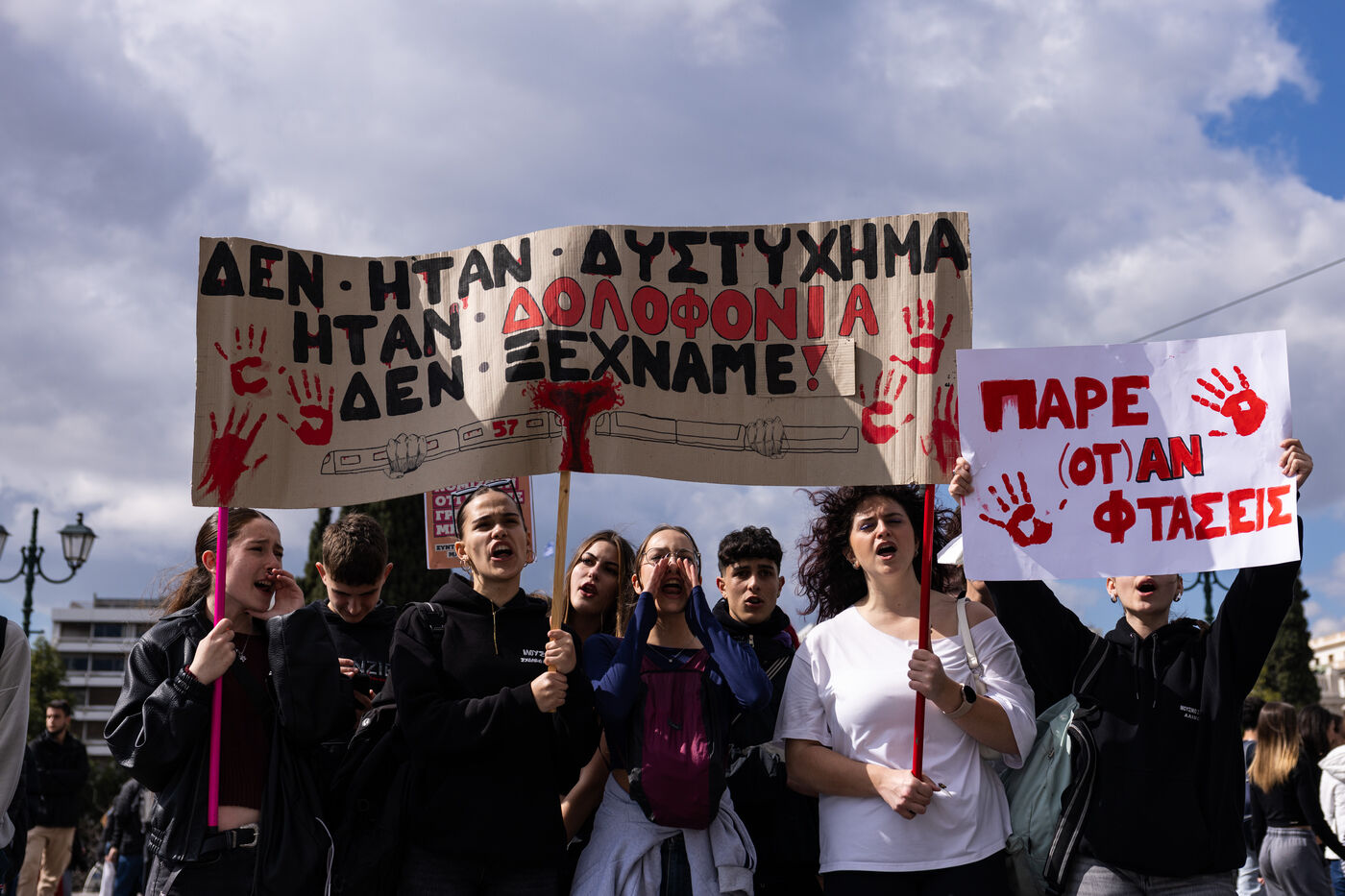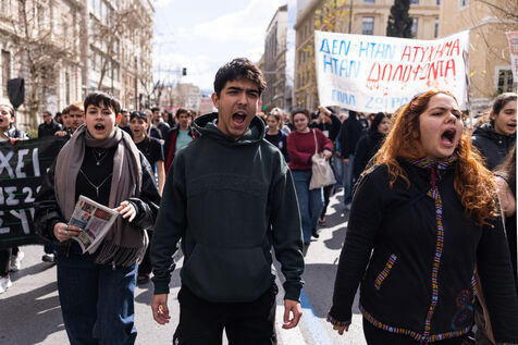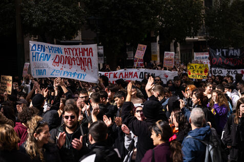 Students and youth organizations gather at Propylaea in central Athens on February 26, 2026, ahead of the third anniversary of the Tempi train disaster. Demonstrators demand accountability for the deadly rail collision that shocked Greece in 2023. Participants call for justice for the victims and structural reforms to improve railway safety standards. The rally includes speeches, banners, and a march through central streets of the Greek capital. Temporary traffic restrictions and the closure of the Panepistimio metro station accompany the protest.