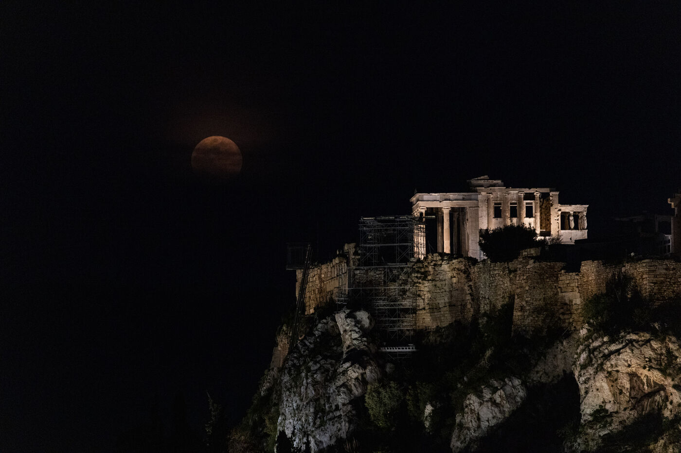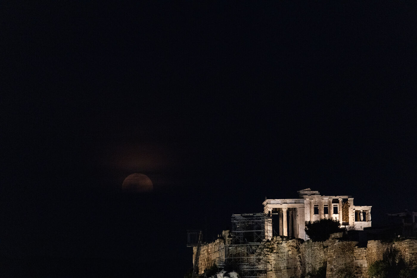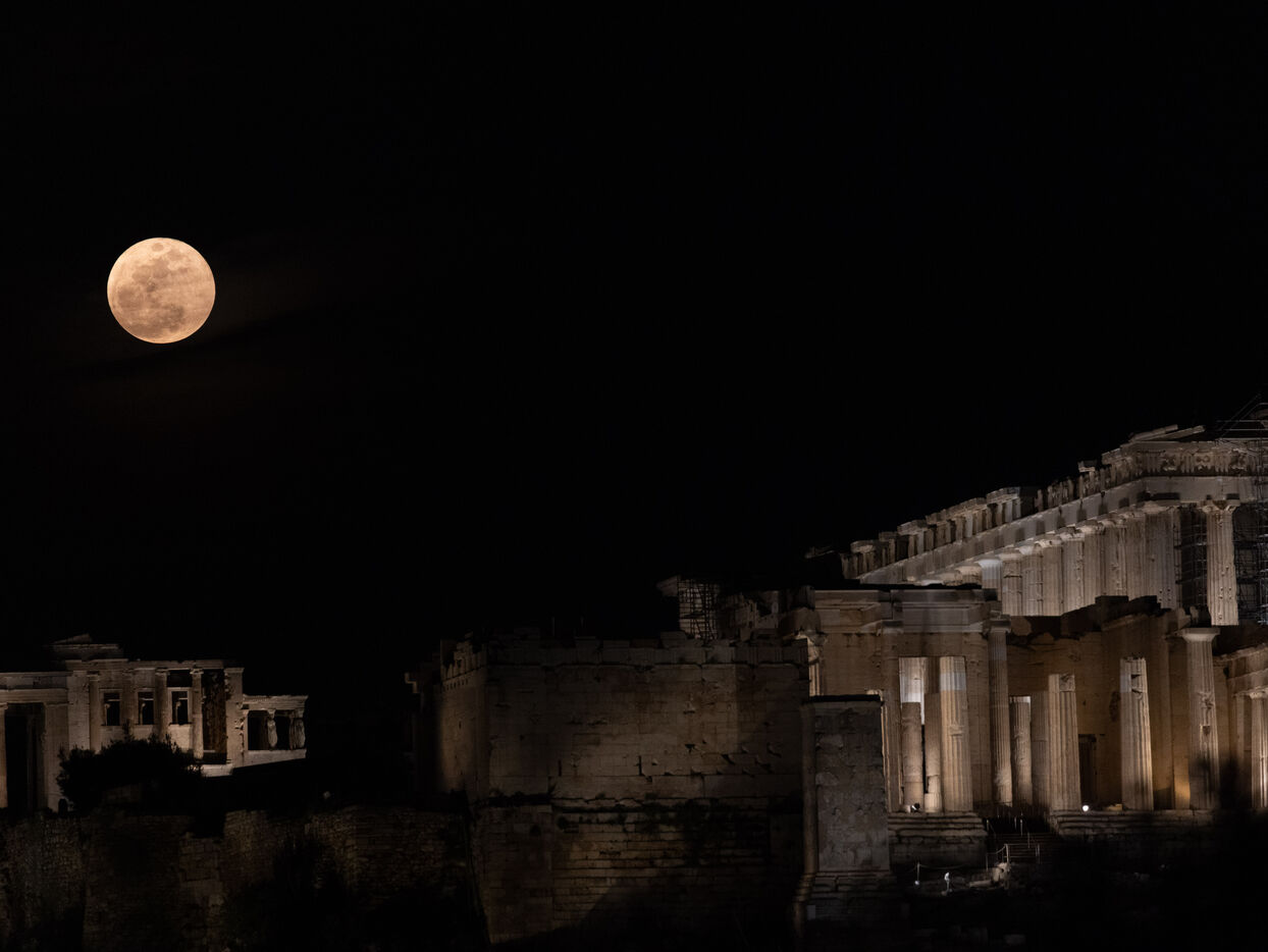 La pleine lune se lève derrière le Parthénon illuminé au sommet de l’Acropole à Athènes, en Grèce, projetant une lumière éclatante sur le monument historique. Alors que la nuit tombe sur la capitale grecque, le disque lunaire apparaît au-dessus de la citadelle antique, contrastant avec le ciel qui s’assombrit. La pleine lune de mars, traditionnellement appelée Lune des Vers, marque la transition de l’hiver au printemps dans l’hémisphère nord. Son illumination maximale attire l’attention des photographes et des visiteurs rassemblés autour du centre historique de la ville. Le phénomène crée un alignement spectaculaire entre l’événement céleste naturel et l’un des sites archéologiques les plus emblématiques au monde.