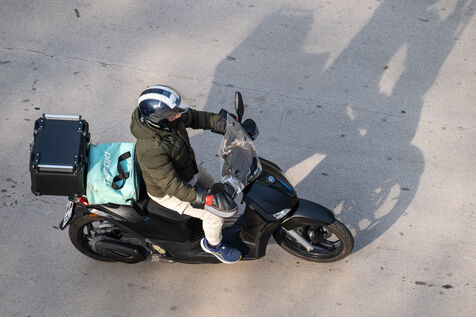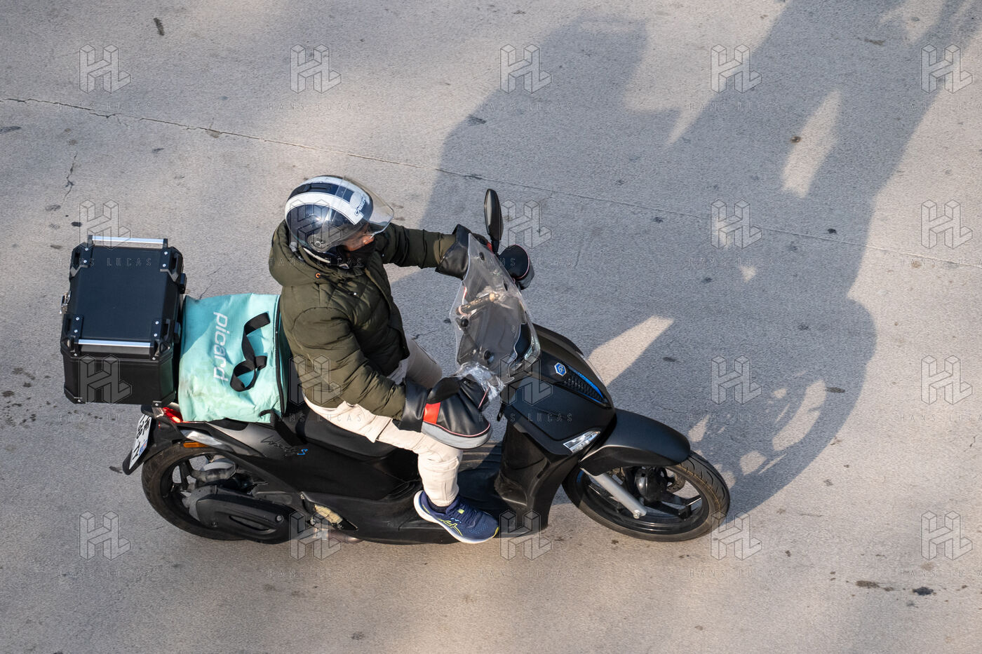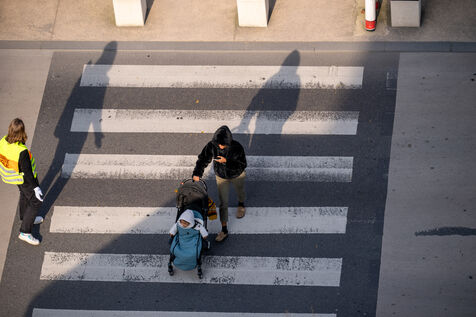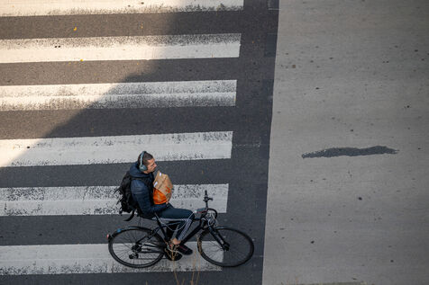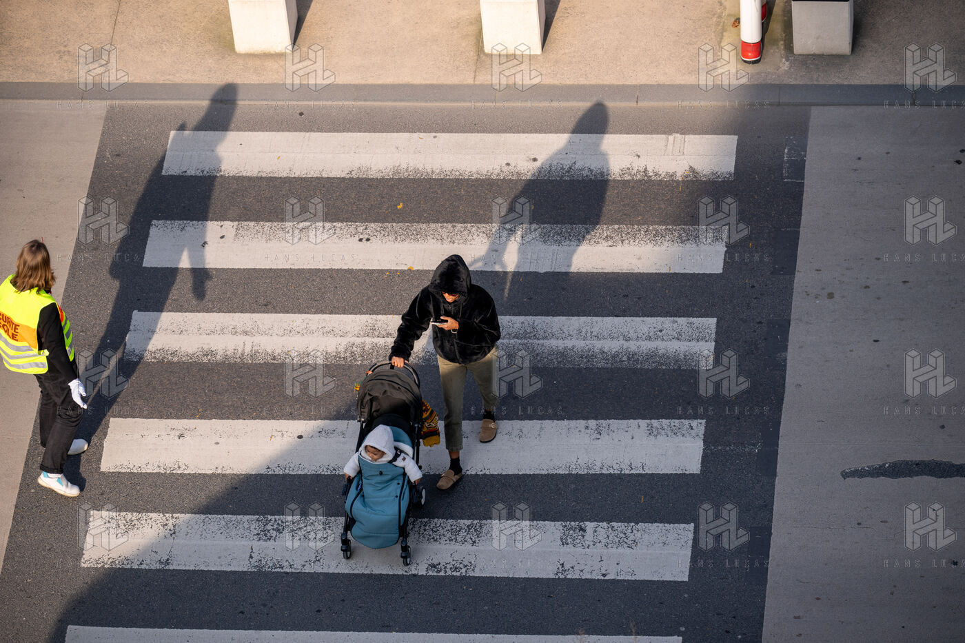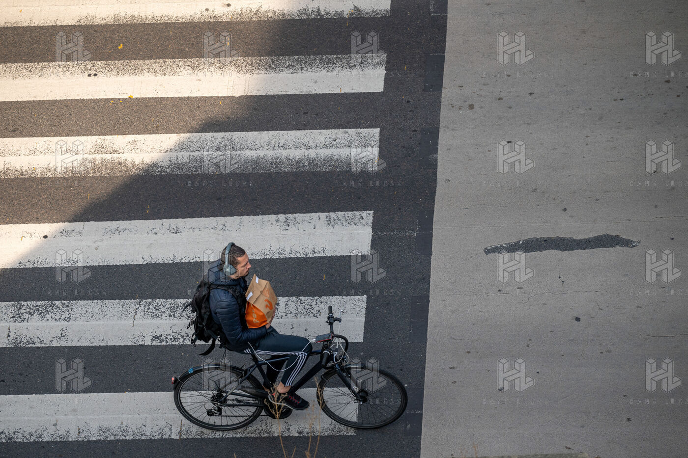 This series was photographed from an elevated point of view in the urban environment. Pedestrians, cyclists and street users are seen while moving, crossing or waiting in public space.