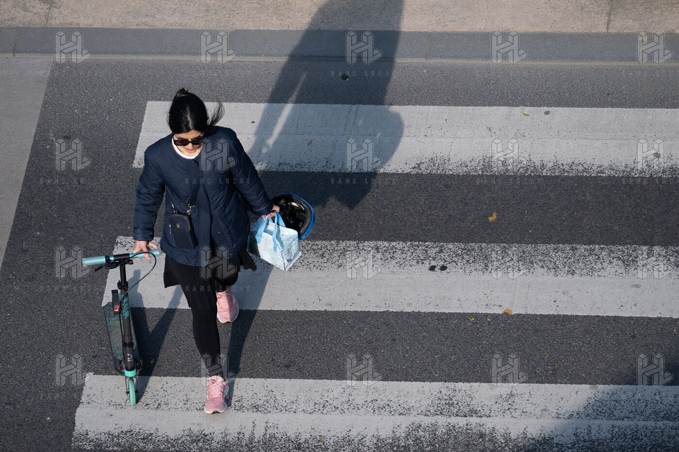 The high angle view transforms ordinary scenes into graphic compositions where lines, crosswalks and shadows structure the image. The series documents movement, urban flows and everyday life in the contemporary city.