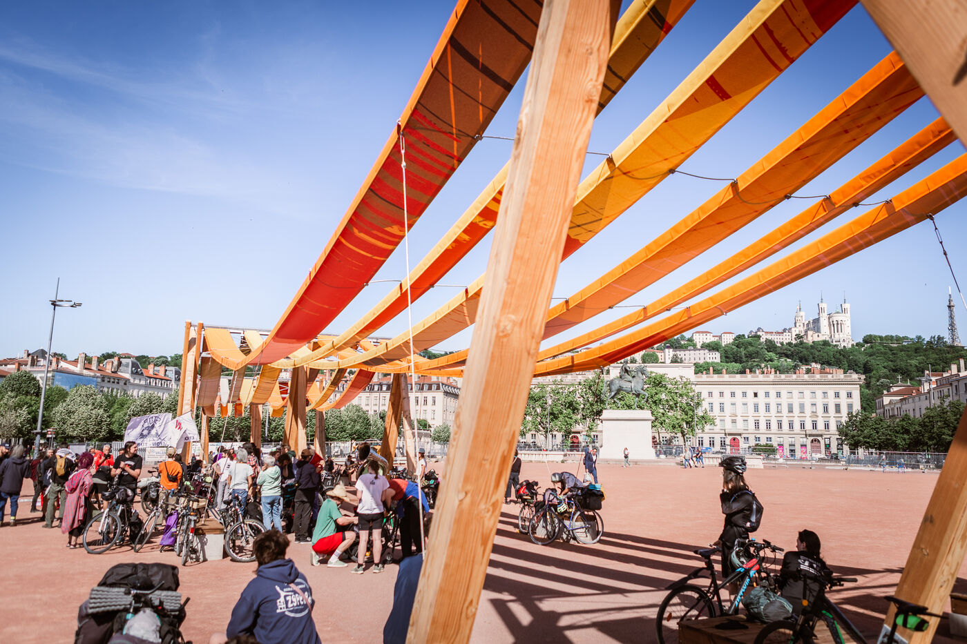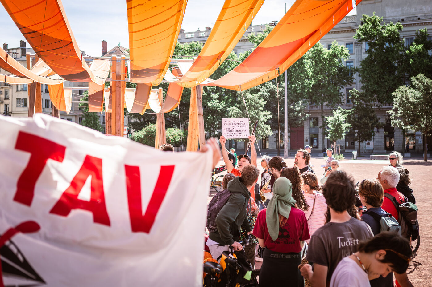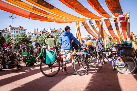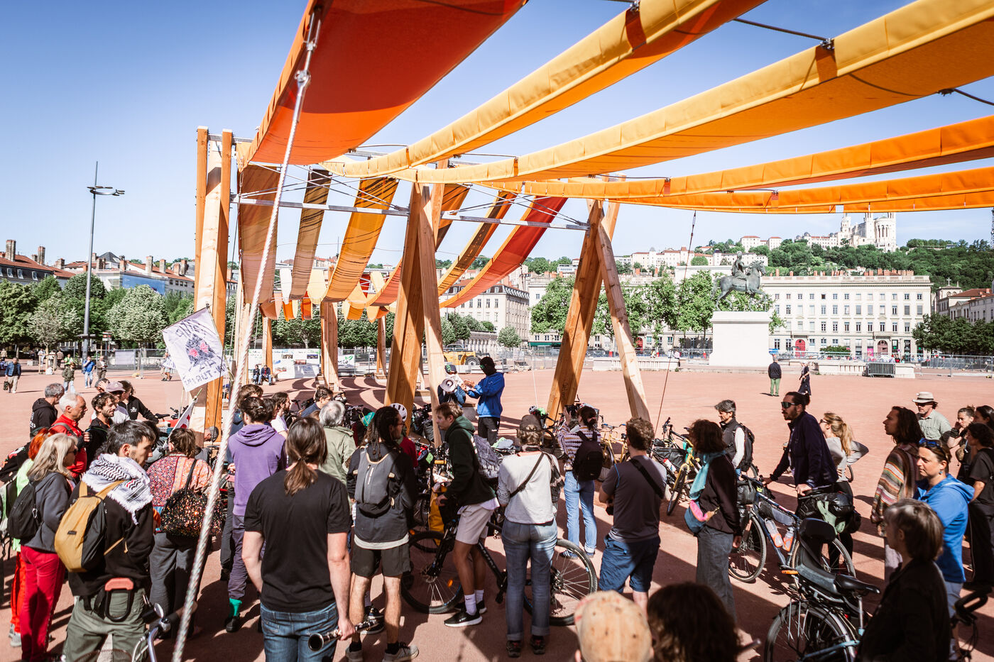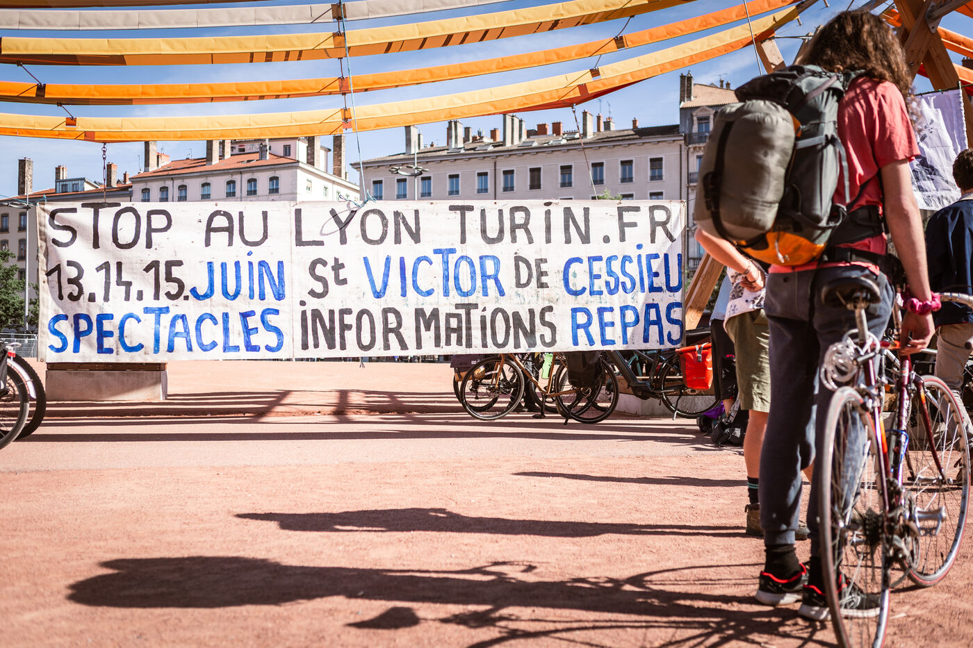 The departure of the Déraillantes convoy against the new Lyon-Turin railway line took place on the Place Bellecour in Lyon en Fance on May 24, 2025. This 9-day bicycle convoy is the initiative of the Earth Upheavals to say Stop to the Lyon-Turin project that involves irreversible changes in hydrogeological cycles.
