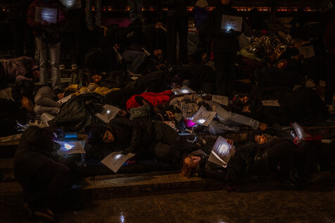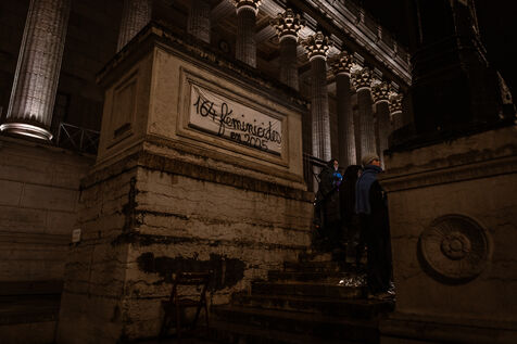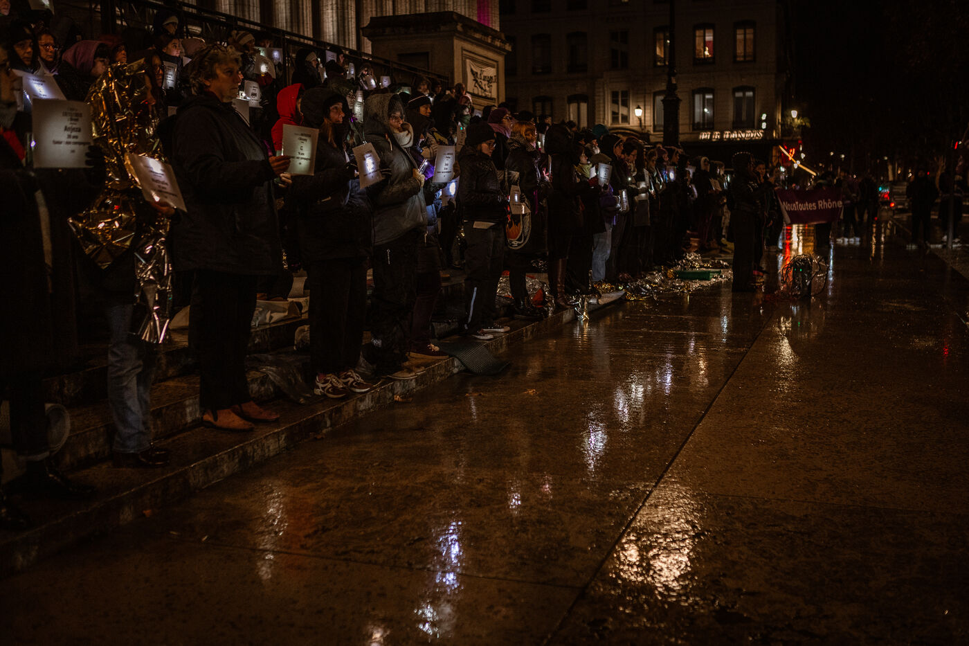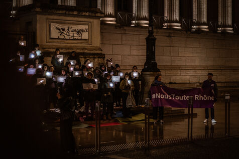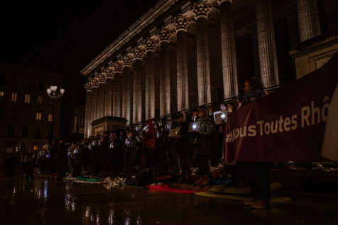 A die-in organized by the collective Nous Toutes Rhône took place in Lyon, France on January 10, 2025, in memory of all the victims of femicides this year.