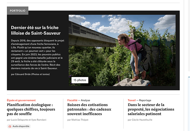 Edouard Bride Publications Séries / Archive Environnement — Lille — Société — Sélection de séries Libération - 2024 Libération - 2024 Les Jours - 2024 Les jours - 2024 Les Jours - 2024 L'Humanité - 2024 Ouest France - 2024 Les Jours - 2024 Puzzle - 2024 Puzzle - 2024 Mediapart (portfolio) - 2023 Le Parisien - Aujourd'hui en France - 2023 Mediapart - 2023 Ouest France - 2023 Mediapart - 2022 La Vie - 2022 Mediapart (portfolio) - 2021 Libération - 2021 Mediapart (portfolio) - 2021 Le Monde - 2021