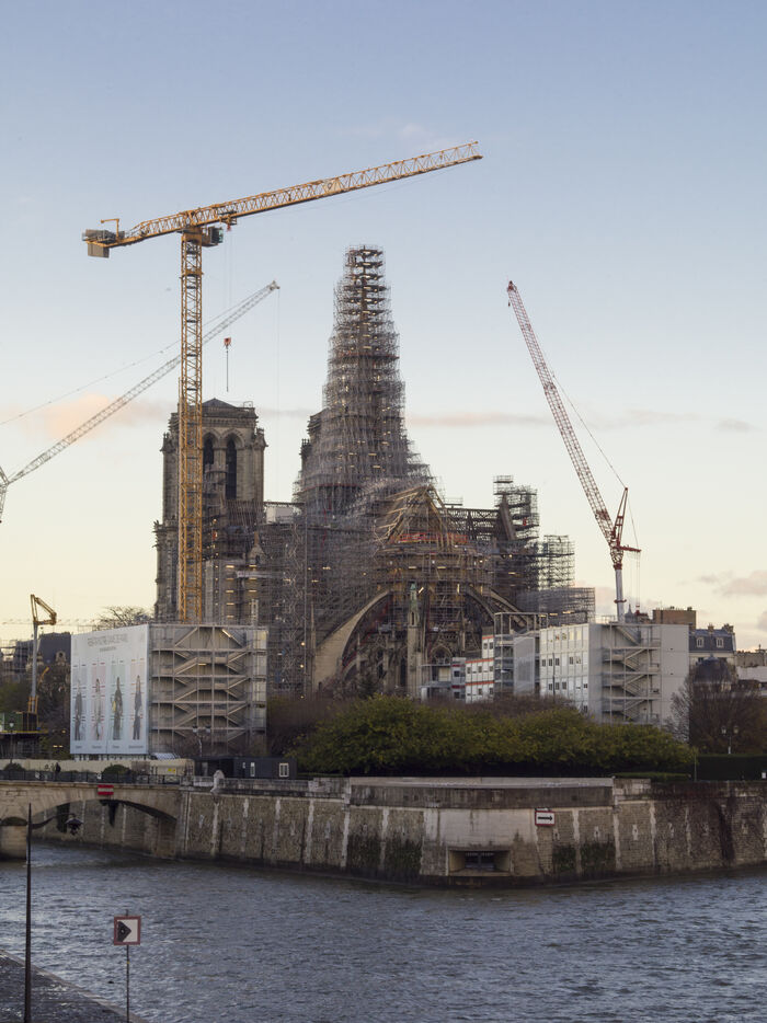 Four and a half years after the fire at Notre-Dame Cathedral and a year before its reopening, the silhouette of the spire can once again be seen through the scaffolding.